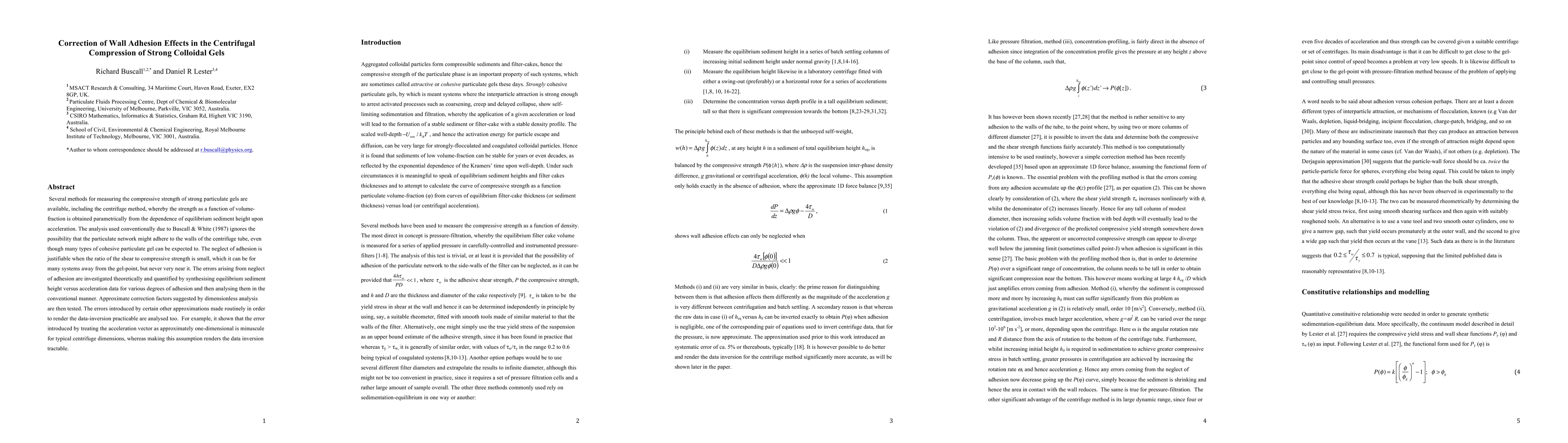 This paper investigates the errors in measuring the compressive strength of strong colloidal gels using the centrifuge method, particularly due to wall adhesion. It proposes correction factors to account for adhesion effects and analyzes the impact of other common approximations, finding that the one-dimensional acceleration assumption is nearly accurate for practical centrifuge dimensions.