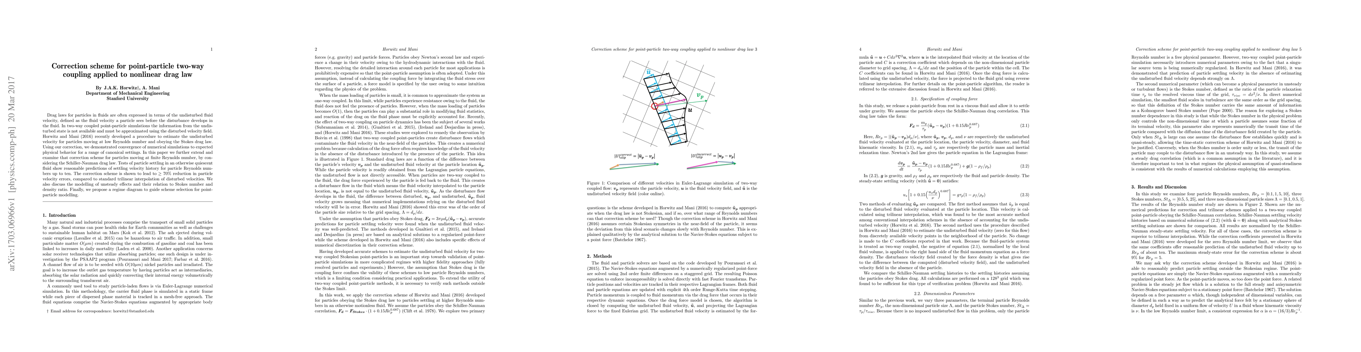 This paper proposes a correction scheme for estimating undisturbed fluid velocity in two-way coupled point-particle simulations, extending it to finite Reynolds numbers using the Schiller-Nauman drag law. The method shows significant reductions in particle velocity errors and reasonable predictions for particle settling velocities.