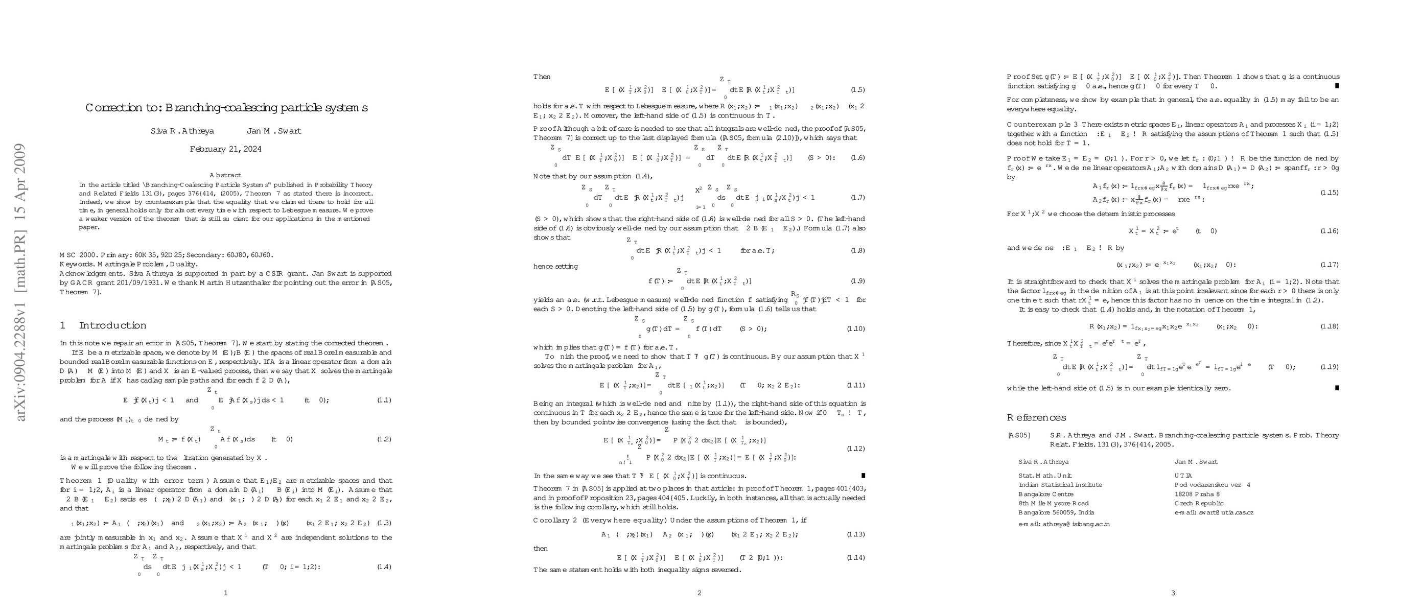 Researchers corrected a mistake in a 2005 paper on particle systems, showing that a key equality does not hold for all time but instead occurs almost every time with respect to Lebesgue measure.