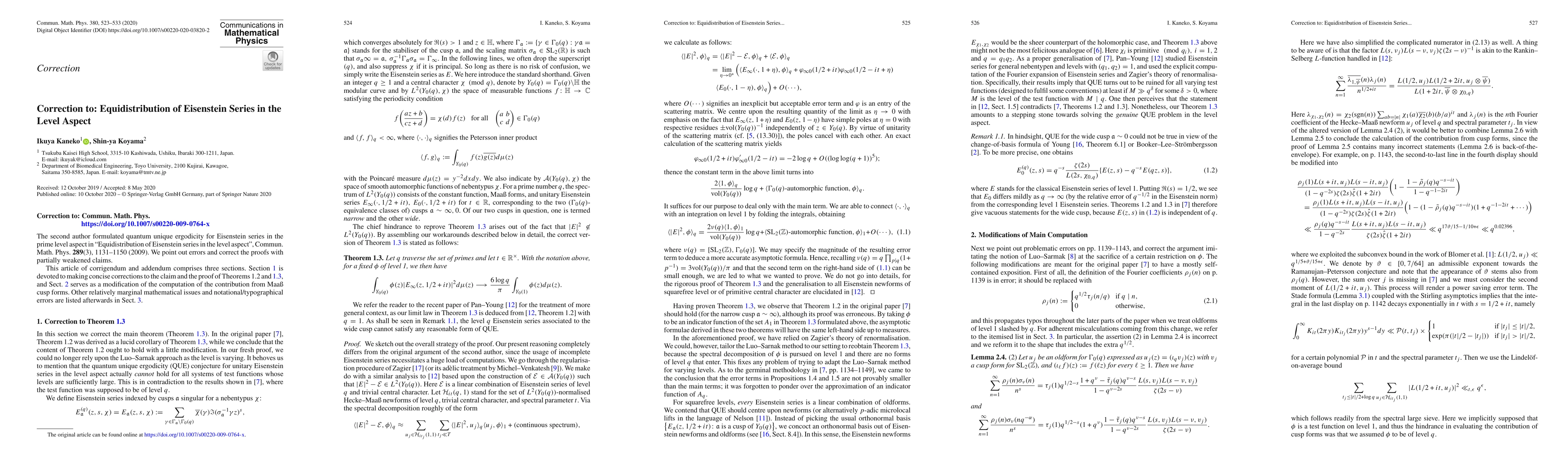The second author formulated quantum unique ergodicity for Eisenstein series in the prime level aspect in "Equidistribution of Eisenstein series in the level aspect", Commun. Math. Phys. 289(3), 1131-1150 (2009). We point out errors and correct the proofs with partially weakened claims. This article of corrigendum and addendum comprises three sections. Section 1 is devoted to making concise corrections to the claim and the proof of Theorems 1.2 and 1.3, and Sect. 2 serves as a modification of the computation of the contribution from Maass cusp forms. Other relatively marginal mathematical issues and notational/typographical errors are listed afterwards in Sect. 3.