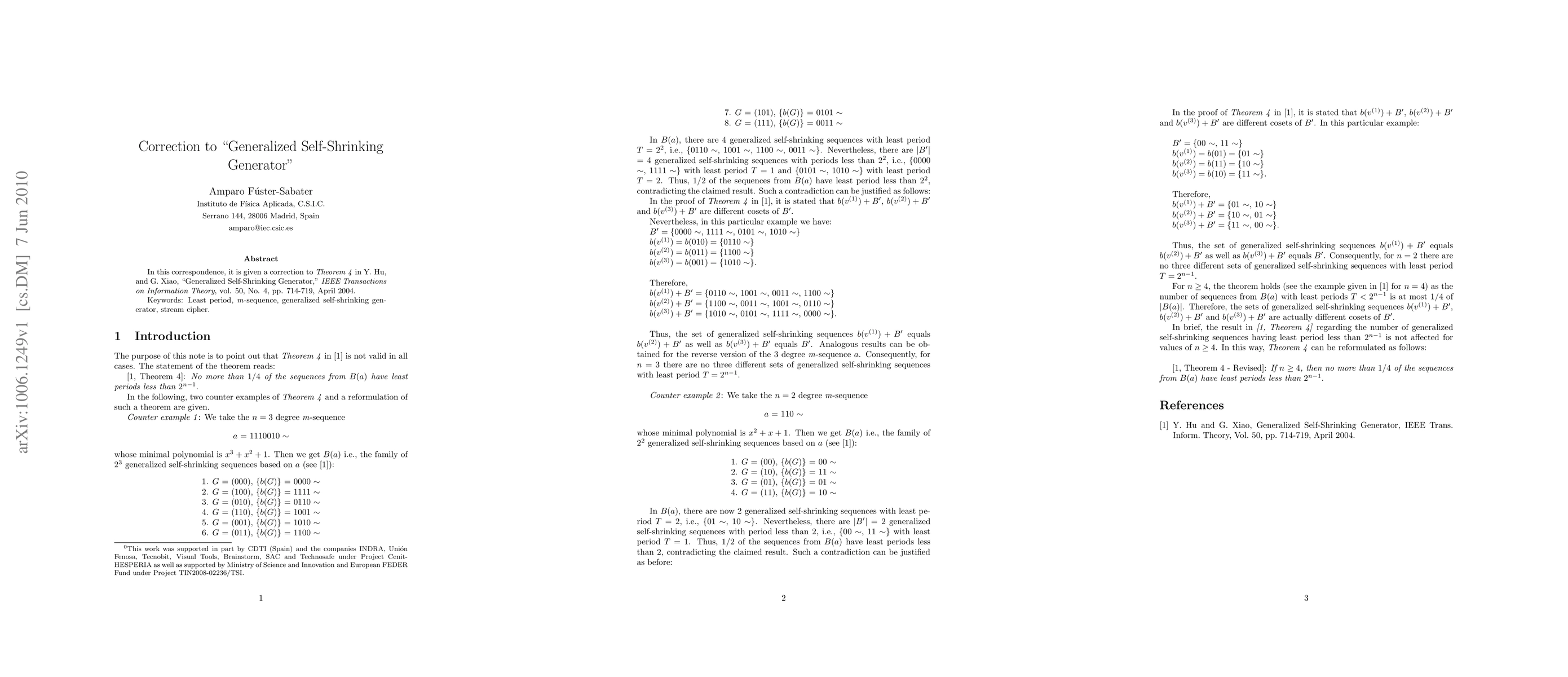 In this correspondence, it is given a correction to Theorem 4 in Y. Hu, and G. Xiao, "Generalized Self-Shrinking Generator," IEEE Transactions on Information Theory, vol. 50, No. 4, pp. 714-719, April 2004.