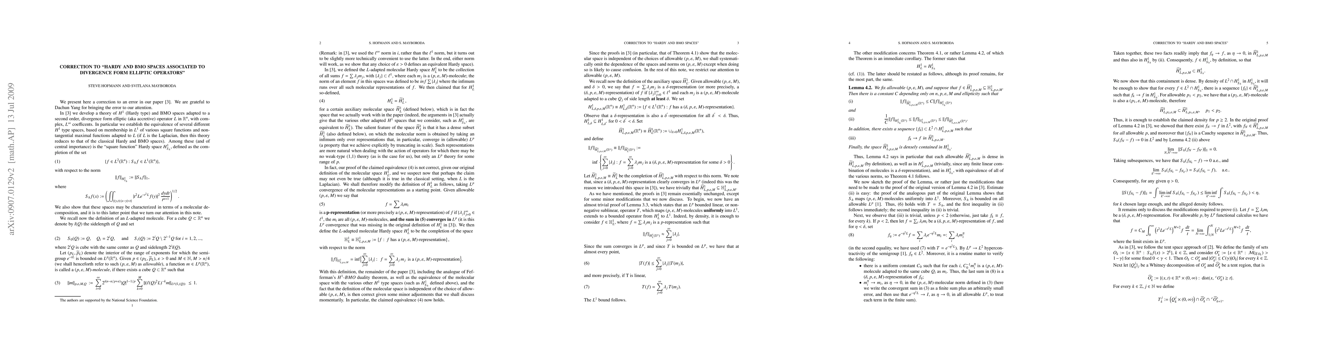 Summary: This note corrects errors found in the original paper by Hofmann and Mayboroda on Hardy and BMO spaces related to divergence form elliptic operators, ensuring the accuracy and reliability of the results presented.