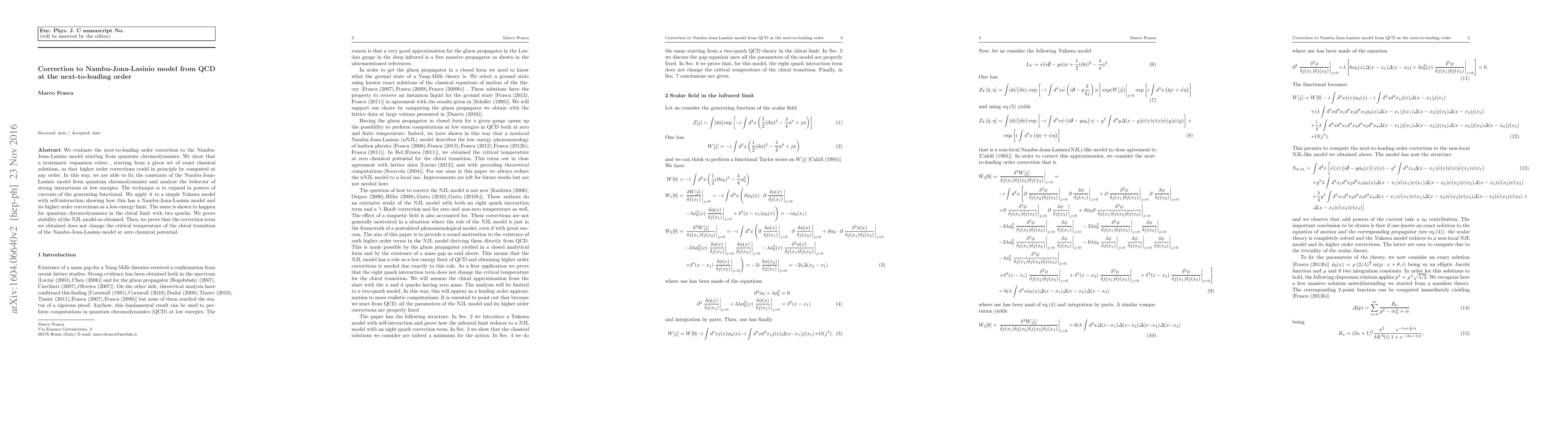 We evaluate the next-to-leading order correction to the Nambu-Jona-Lasinio model starting from quantum chromodynamics. We show that a systematic expansion exists, starting from a given set of exact classical solutions, so that higher order corrections could in principle be computed at any order. In this way, we are able to fix the constants of the Nambu-Jona-Lasinio model from quantum chromodynamics and analyze the behavior of strong interactions at low energies. The technique is to expand in powers of currents of the generating functional. We apply it to a simple Yukawa model with self-interaction showing how this has a Nambu-Jona-Lasinio model and its higher order corrections as a low-energy limit. The same is shown to happen for quantum chromodynamics in the chiral limit with two quarks. We prove stability of the NJL model so obtained. Then, we prove that the correction term we obtained does not change the critical temperature of the chiral transition of the Nambu-Jona-Lasinio model at zero chemical potential.