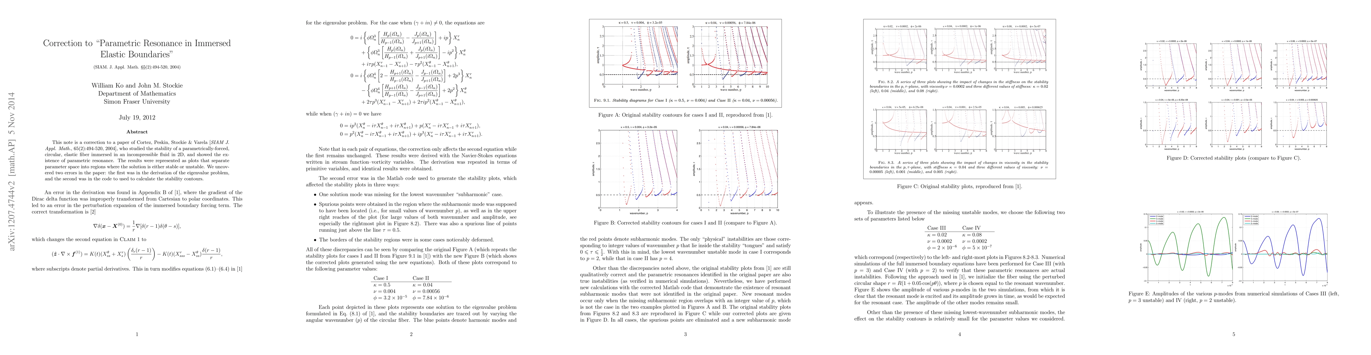This note is a correction to a paper of Cortez, Peskin, Stockie & Varela [SIAM J. Appl. Math., 65(2):494-520, 2004], who studied the stability of a parametrically-forced, circular, elastic fiber immersed in an incompressible fluid in 2D, and showed the existence of parametric resonance. The results were represented as plots that separate parameter space into regions where the solution is either stable or unstable. We uncovered two errors in the paper: the first was in the derivation of the eigenvalue problem, and the second was in the code to used to calculate the stability contours.