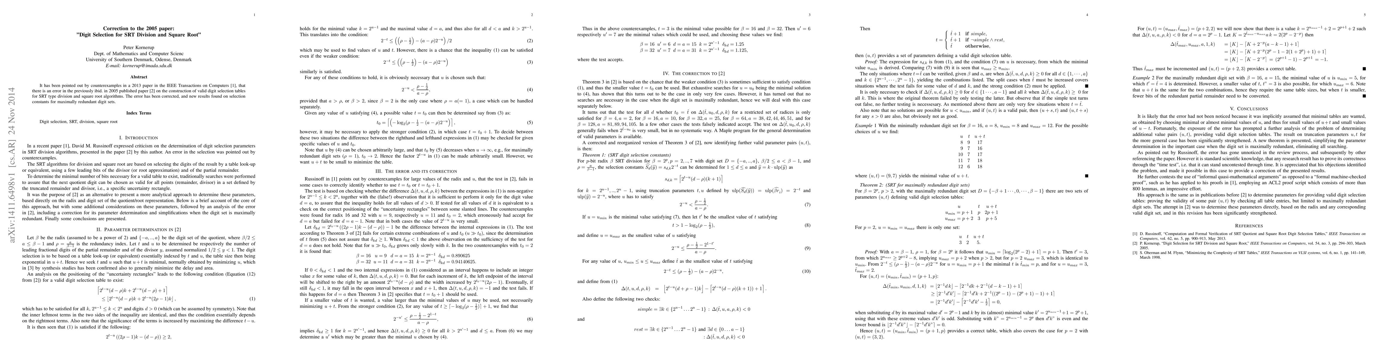 Summary: This paper corrects an error identified in a 2005 study on digit selection for SRT division and square root algorithms, and presents new findings on selection constants for maximally redundant digit sets.