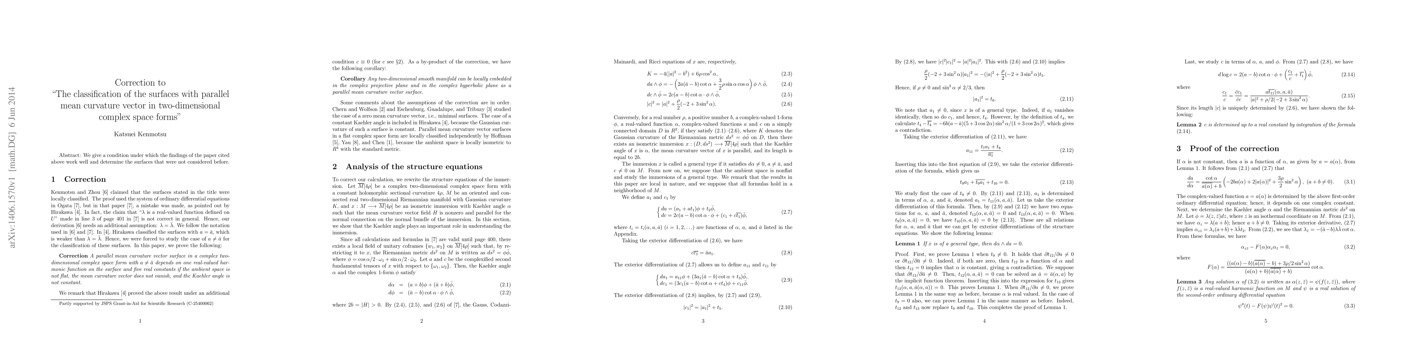 This correction to a previous paper specifies a condition for the classification of surfaces with parallel mean curvature vector in non-flat, two-dimensional complex space forms. It shows these surfaces depend on one harmonic function and five constants, given the mean curvature vector doesn't vanish and the Kähler angle isn't constant.