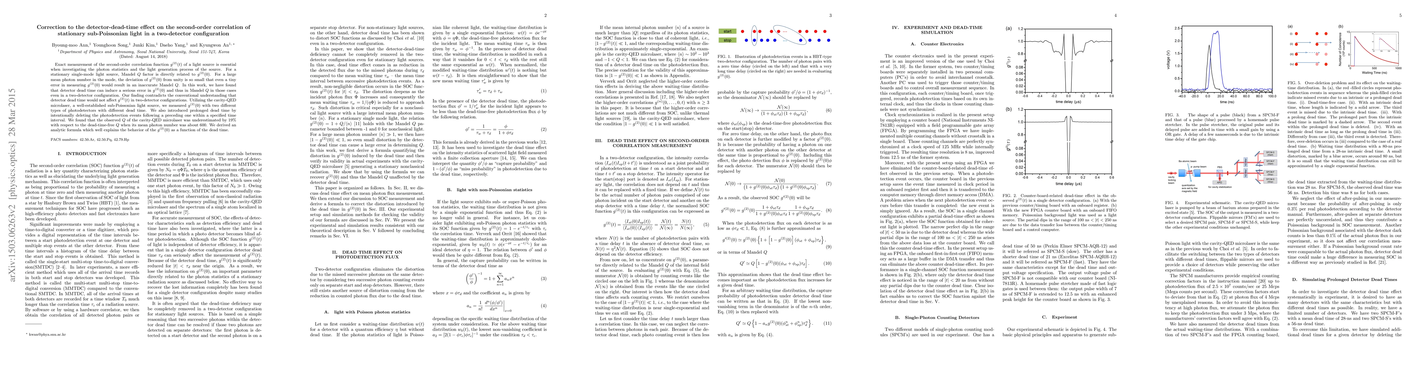 This paper corrects the understanding of detector dead time's impact on the second-order correlation function $g^{(2)}(t)$ of sub-Poissonian light, revealing that it significantly affects $g^{(2)}(t)$ even in two-detector setups. The study found a 19% underestimation of the Mandel Q factor when the mean photon number was around 600, providing an analytic formula to explain this behavior.