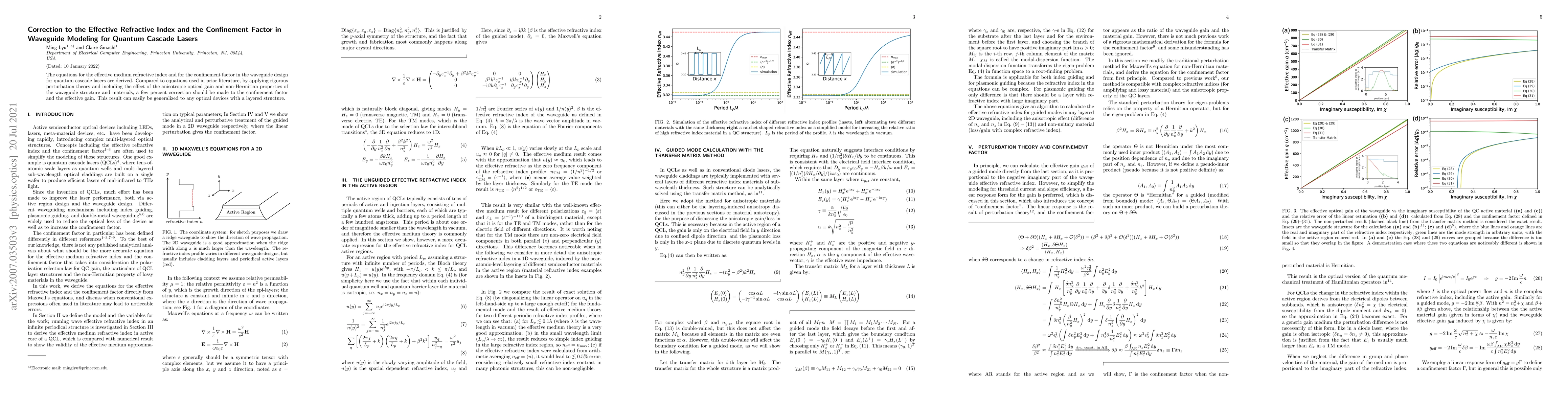The equations for the effective medium refractive index and for the confinement factor in the waveguide design for quantum cascade lasers are derived.Compared to equations used in prior literature, by applying rigorous perturbation theory and including the effect of the anisotropic optical gain and non-Hermitian properties of the waveguide structure and materials, a few percent correction should be made to the confinement factor and the effective gain. This result can easily be generalized to any optical devices with a layered structure.