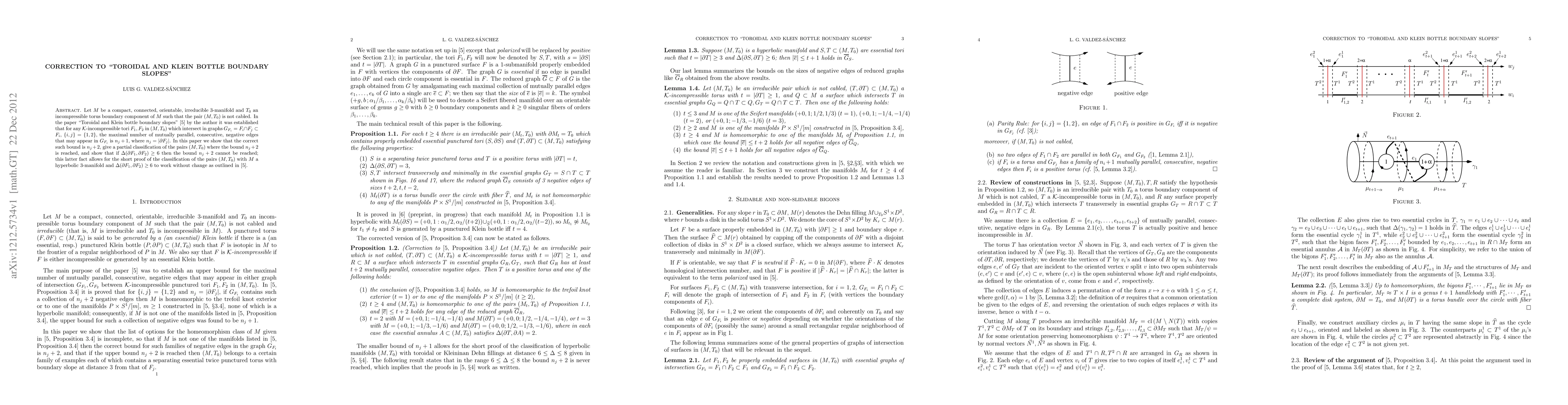 This paper corrects a bound in the original study on toroidal and Klein bottle boundary slopes, establishing that the maximal number of mutually parallel, consecutive, negative edges is n'+2 instead of n'+1. It also classifies pairs (M,T) where this new bound is achieved and shows that the bound cannot be reached if the distance between boundary slopes is at least 6.