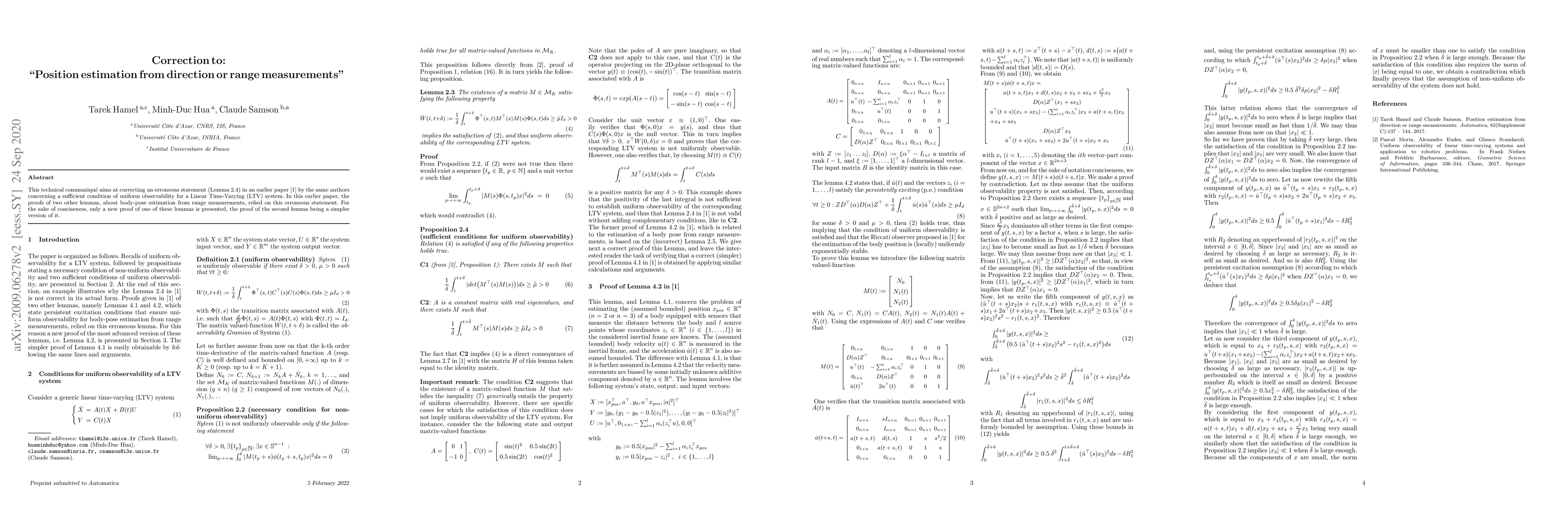 This technical communiqu\'e aims at correcting an erroneous statement (Lemma 2.4) in an earlier paper by the same authors concerning a sufficient condition of uniform observability for a Linear Time-Varying (LTV) system. In this earlier paper, the proofs of two other lemmas, about body-pose estimation from range measurements, relied on this erroneous statement. For the sake of conciseness, only a new proof of one of these lemmas is presented, the proof of the second lemma being a simpler version of it.