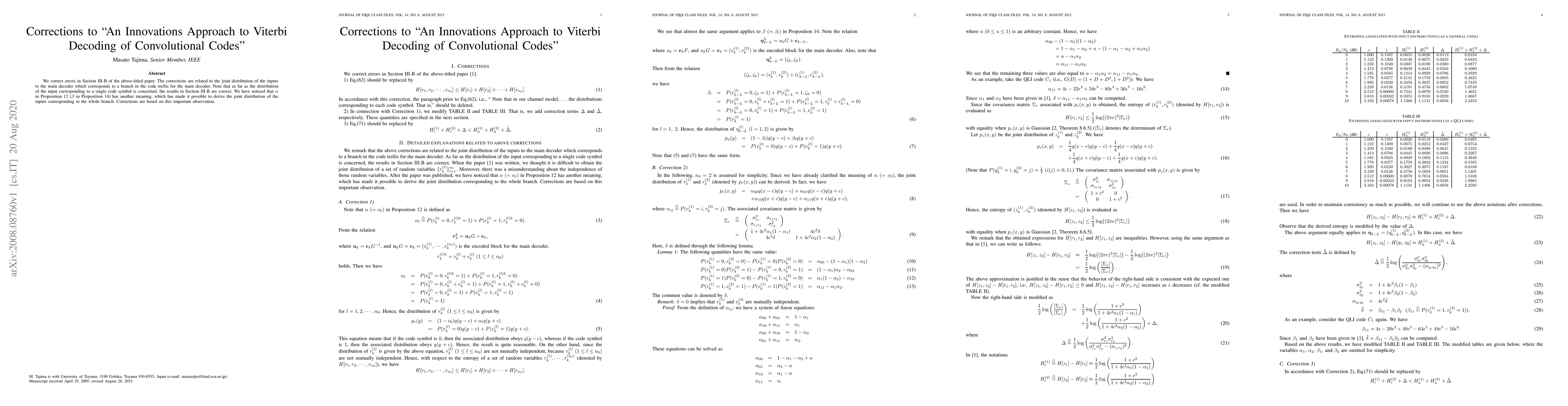 We correct errors in Section III-B of the above-titled paper. The corrections are related to the joint distribution of the inputs to the main decoder which corresponds to a branch in the code trellis for the main decoder. Note that as far as the distribution of the input corresponding to a single code symbol is concerned, the results in Section III-B are correct. We have noticed that alpha in Proposition 12 (beta in Proposition 14) has another meaning, which has made it possible to derive the joint distribution of the inputs corresponding to the whole branch. Corrections are based on this important observation.