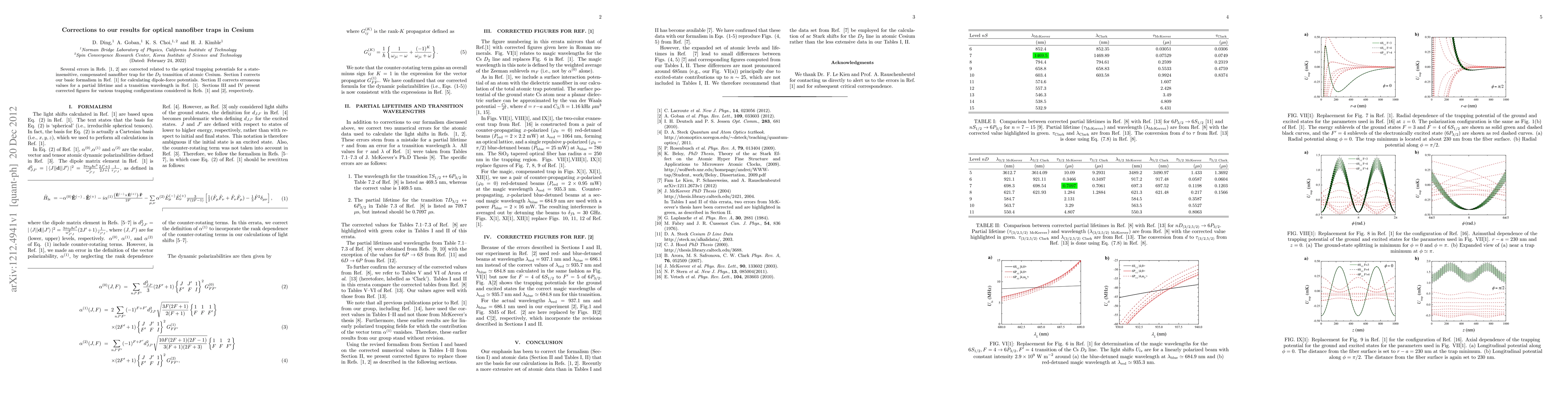 Several errors in Refs. [1, 2] are corrected related to the optical trapping potentials for a state-insensitive, compensated nanofiber trap for the D2 transition of atomic Cesium. Section I corrects our basic formalism in Ref. [1] for calculating dipole-force potentials. Section II corrects erroneous values for a partial lifetime and a transition wavelength in Ref. [1]. Sections III and IV present corrected figures for various trapping configurations considered in Refs. [1] and [2], respectively.