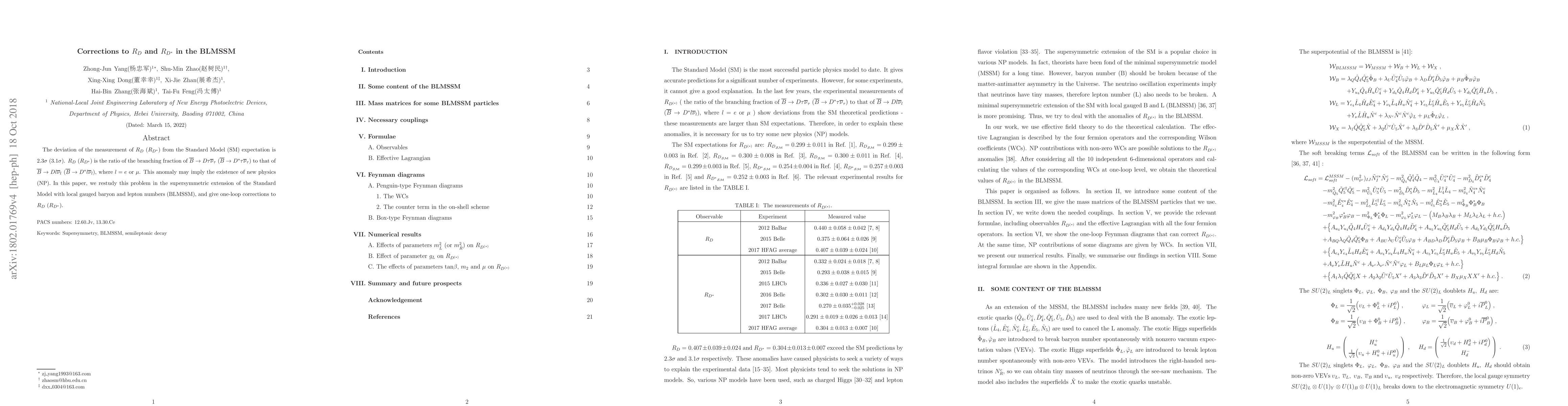 The deviation of the measurement of $R_{D}$ ($R_{D^{*}}$) from the Standard Model (SM) expectation is $2.3\sigma$ ($3.1\sigma$). $R_{D}$ ($R_{D^{*}}$) is the ratio of the branching fraction of $\overline{B} \rightarrow D\tau\overline{\nu}_{\tau}$ ($\overline{B} \rightarrow D^{*}\tau\overline{\nu}_{\tau}$) to that of $\overline{B} \rightarrow Dl\overline{\nu}_{l}$ ($\overline{B} \rightarrow D^{*}l\overline{\nu}_{l}$), where $l = e$ or $\mu$. This anomaly may imply the existence of new physics (NP). In this paper, we restudy this problem in the supersymmetric extension of the Standard Model with local gauged baryon and lepton numbers (BLMSSM), and give one-loop corrections to $R_{D}$ ($R_{D^{*}}$).