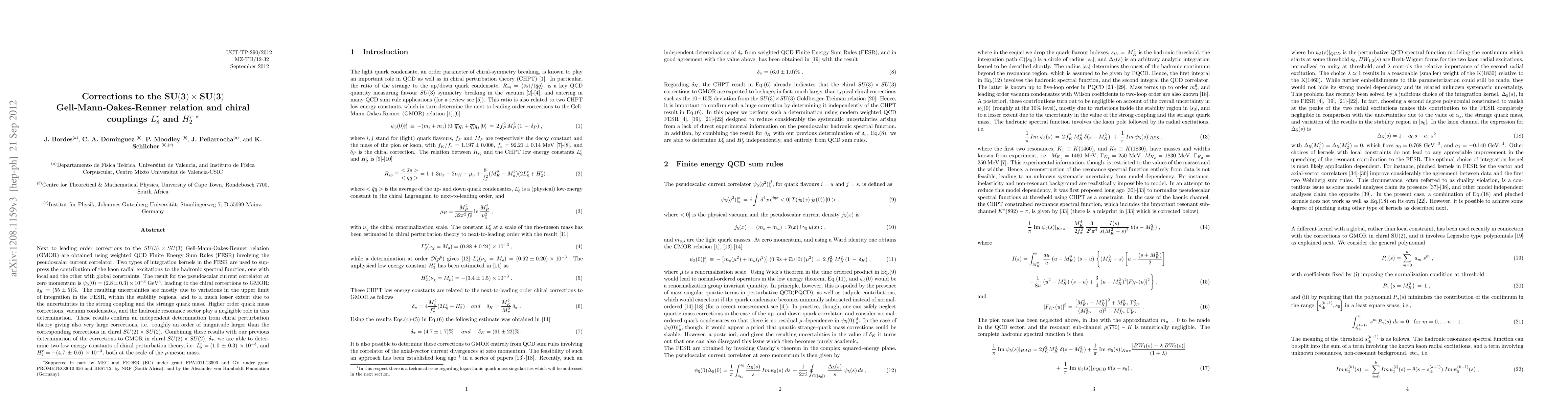 Next to leading order corrections to the $SU(3) \times SU(3)$ Gell-Mann-Oakes-Renner relation (GMOR) are obtained using weighted QCD Finite Energy Sum Rules (FESR) involving the pseudoscalar current correlator. Two types of integration kernels in the FESR are used to suppress the contribution of the kaon radial excitations to the hadronic spectral function, one with local and the other with global constraints. The result for the pseudoscalar current correlator at zero momentum is $\psi_5(0) = (2.8 \pm 0.3) \times 10^{-3} GeV^{4}$, leading to the chiral corrections to GMOR: $\delta_K = (55 \pm 5)%$. The resulting uncertainties are mostly due to variations in the upper limit of integration in the FESR, within the stability regions, and to a much lesser extent due to the uncertainties in the strong coupling and the strange quark mass. Higher order quark mass corrections, vacuum condensates, and the hadronic resonance sector play a negligible role in this determination. These results confirm an independent determination from chiral perturbation theory giving also very large corrections, i.e. roughly an order of magnitude larger than the corresponding corrections in chiral $SU(2) \times SU(2)$. Combining these results with our previous determination of the corrections to GMOR in chiral $SU(2) \times SU(2)$, $\delta_\pi$, we are able to determine two low energy constants of chiral perturbation theory, i.e. $L^r_8 = (1.0 \pm 0.3) \times 10^{-3}$, and $H^r_2 = - (4.7 \pm 0.6) \times 10^{-3}$, both at the scale of the $\rho$-meson mass.