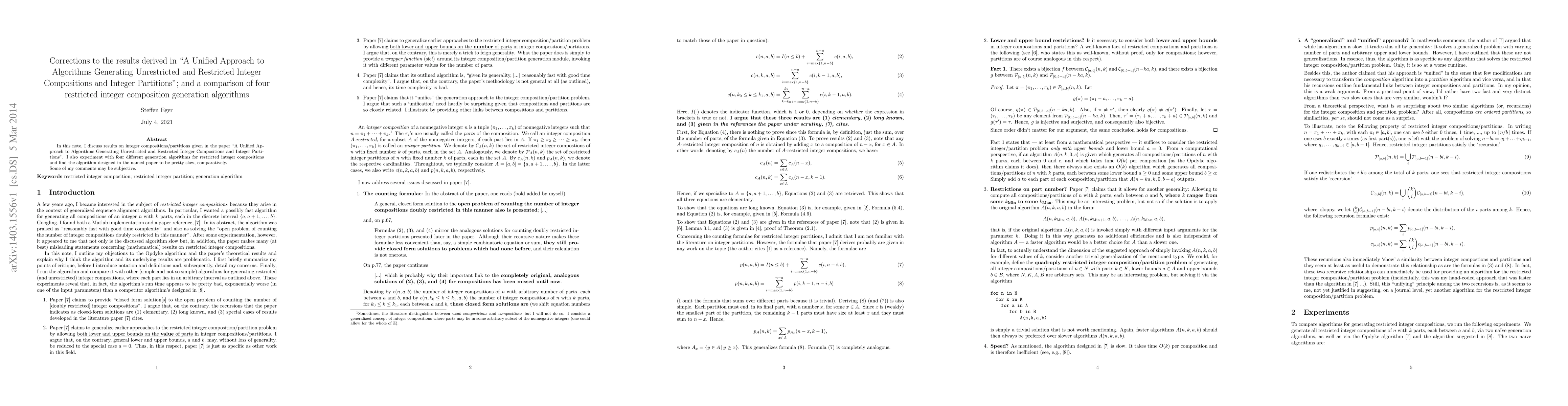 Summary: This paper corrects results from a previous study on integer compositions and partitions, and evaluates four algorithms for generating restricted integer compositions, finding the one from the original paper to be notably slower. Some observations are subjective.