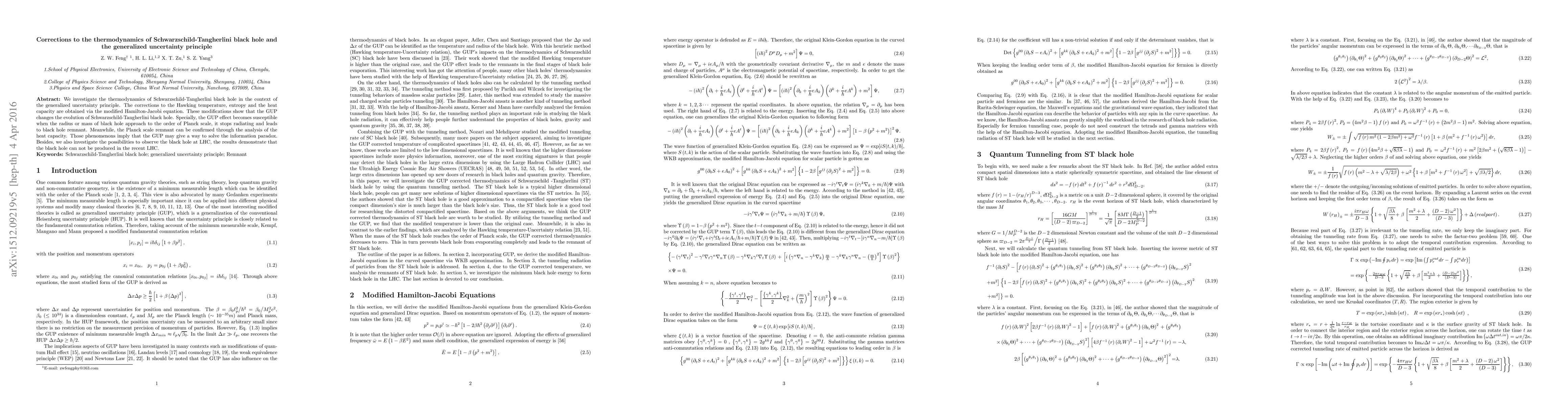 This paper examines the thermodynamics of Schwarzschild-Tangherlini black holes under the generalized uncertainty principle, revealing corrections to Hawking temperature, entropy, and heat capacity. The study suggests that the GUP may resolve the information paradox by causing black holes to become remnants at the Planck scale.