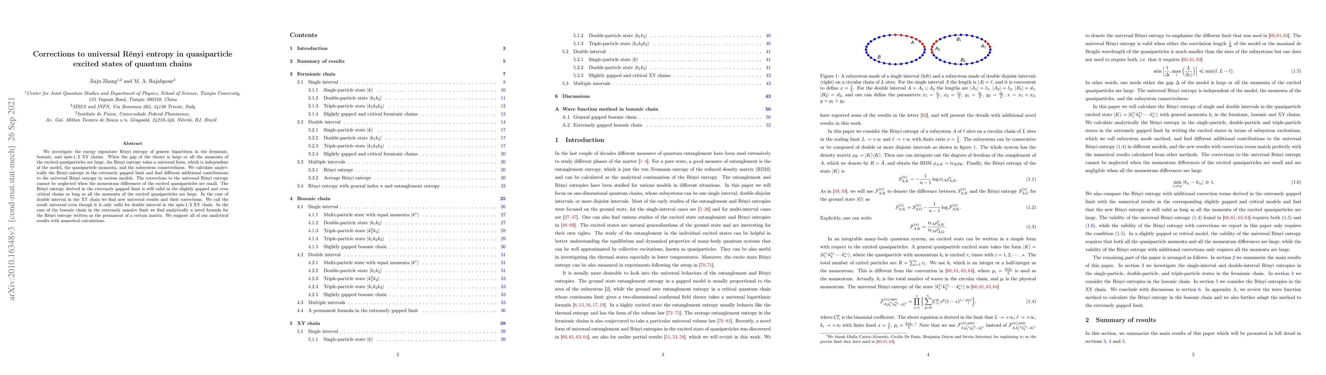 This paper investigates the R\'enyi entropy in quasiparticle excited states of quantum chains, finding that it takes a universal form under certain conditions. It provides analytical corrections to this universal entropy, showing that these corrections are significant when quasiparticle momentum differences are small, and supports these findings with numerical calculations.