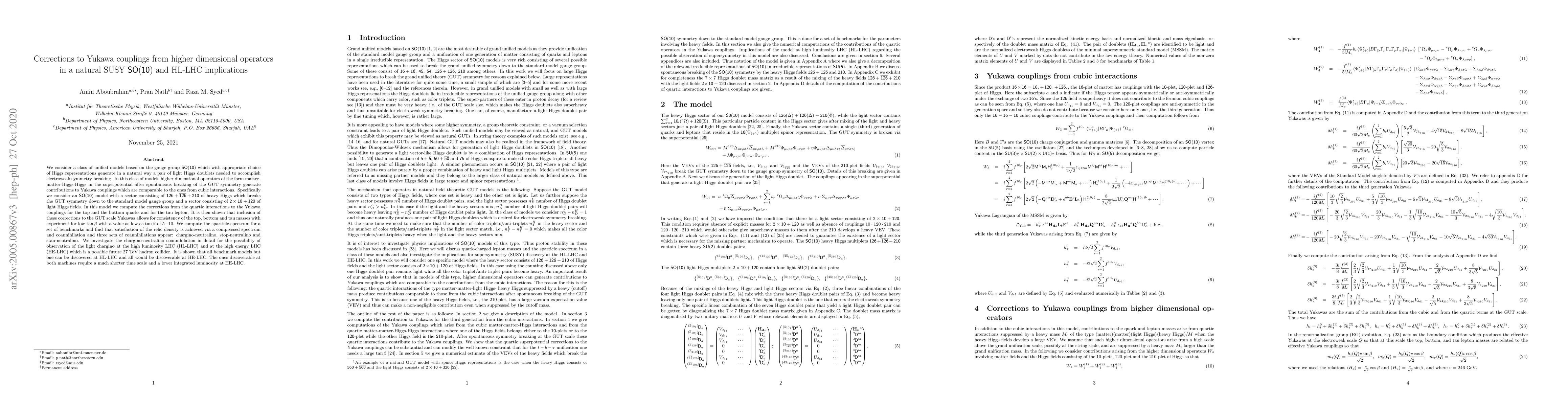 We consider a class of unified models based on the gauge group $\mathsf{SO(10)}$ which with appropriate choice of Higgs representations generate in a natural way a pair of light Higgs doublets needed to accomplish electroweak symmetry breaking. In this class of models higher dimensional operators of the form matter-matter-Higgs-Higgs in the superpotential after spontaneous breaking of the GUT symmetry generate contributions to Yukawa couplings which are comparable to the ones from cubic interactions. Specifically we consider an $\mathsf{SO(10)}$ model with a sector consisting of $\mathsf{126+\overline{126} + 210}$ of heavy Higgs which breaks the GUT symmetry down to the standard model gauge group and a sector consisting of $2\times \mathsf{10+120}$ of light Higgs fields. In this model we compute the corrections from the quartic interactions to the Yukawa couplings for the top and the bottom quarks and for the tau lepton. It is then shown that inclusion of these corrections to the GUT scale Yukawas allows for consistency of the top, bottom and tau masses with experiment for low $\tan\beta$ with a value as low as $\tan\beta$ of 5$-$10. We compute the sparticle spectrum for a set of benchmarks and find that satisfaction of the relic density is achieved via a compressed spectrum and coannihilation and three sets of coannihilations appear: chargino-neutralino, stop-neutralino and stau-neutralino. We investigate the chargino-neutralino coannihilation in detail for the possibility of observation of the light chargino at the high luminosity LHC (HL-LHC) and at the high energy LHC (HE-LHC) which is a possible future 27 TeV hadron collider. It is shown that all benchmark models but one can be discovered at HL-LHC and all would be discoverable at HE-LHC. The ones discoverable at both machines require a much shorter time scale and a lower integrated luminosity at HE-LHC.
