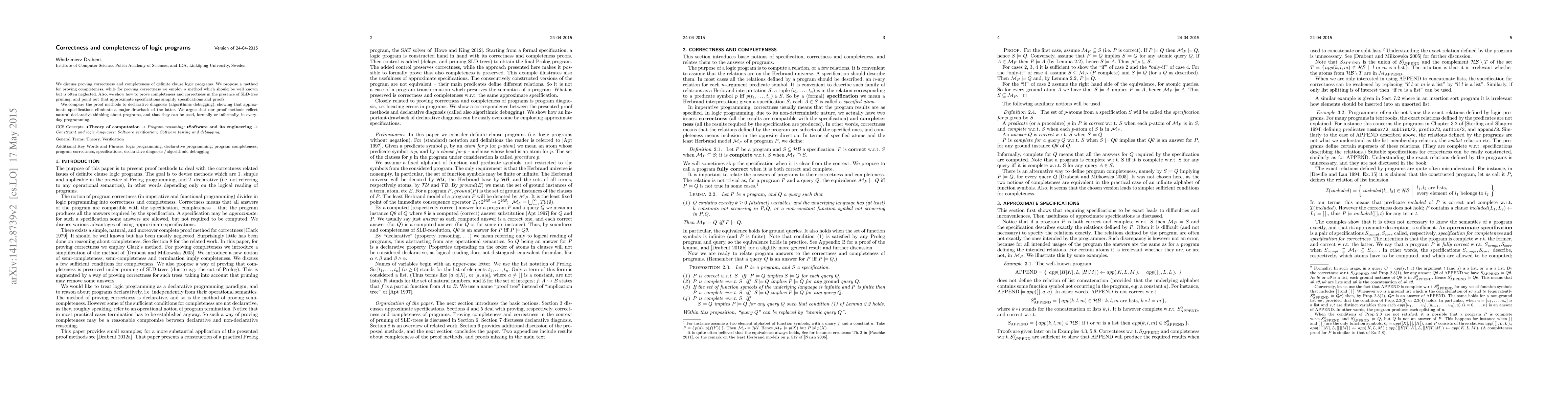 This paper proposes methods for proving the completeness and correctness of definite clause logic programs, emphasizing the use of often-overlooked techniques for correctness. It also addresses these proofs in the context of SLD-tree pruning and demonstrates how approximate specifications can simplify both specifications and proofs. The paper compares these methods to declarative diagnosis, highlighting the benefits of approximate specifications.