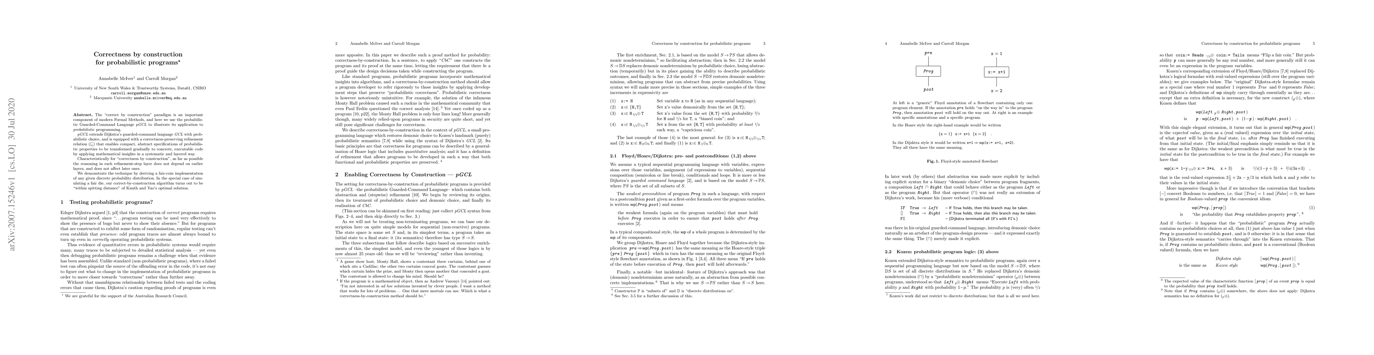 The "correct by construction" paradigm is an important component of modern Formal Methods, and here we use the probabilistic Guarded-Command Language $\mathit{pGCL}$ to illustrate its application to $\mathit{probabilistic}$ programming. $\mathit{pGCL}$ extends Dijkstra's guarded-command language $\mathit{GCL}$ with probabilistic choice, and is equipped with a correctness-preserving refinement relation $(\sqsubseteq)$ that enables compact, abstract specifications of probabilistic properties to be transformed gradually to concrete, executable code by applying mathematical insights in a systematic and layered way. Characteristically for "correctness by construction", as far as possible the reasoning in each refinement-step layer does not depend on earlier layers, and does not affect later ones. We demonstrate the technique by deriving a fair-coin implementation of any given discrete probability distribution. In the special case of simulating a fair die, our correct-by-construction algorithm turns out to be "within spitting distance" of Knuth and Yao's optimal solution.