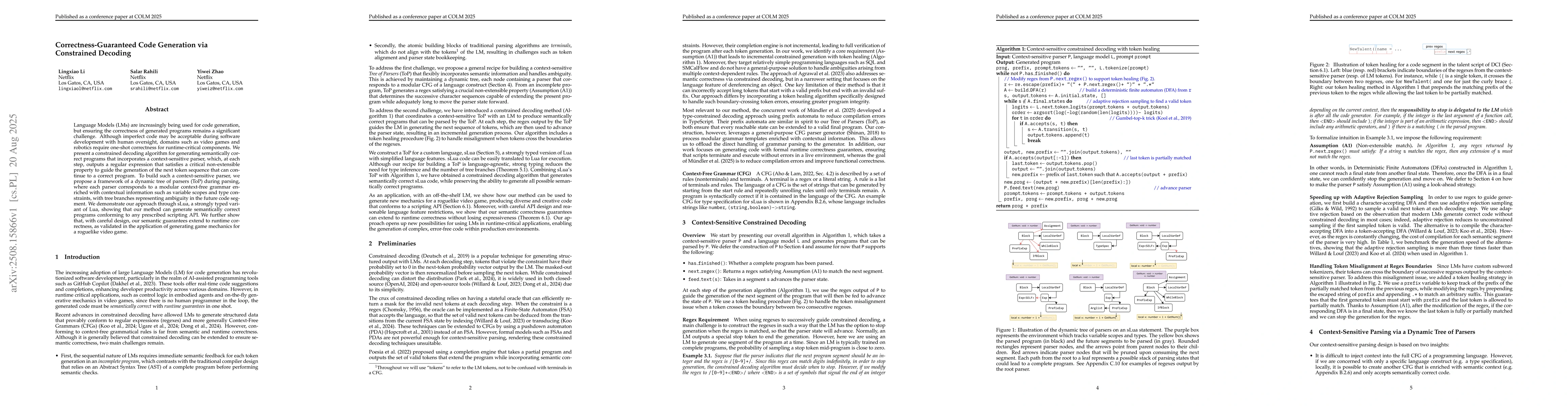 Language Models (LMs) are increasingly being used for code generation, but ensuring the correctness of generated programs remains a significant challenge. Although imperfect code may be acceptable during software development with human oversight, domains such as video games and robotics require one-shot correctness for runtime-critical components. We present a constrained decoding algorithm for generating semantically correct programs that incorporates a context-sensitive parser, which, at each step, outputs a regular expression that satisfies a critical non-extensible property to guide the generation of the next token sequence that can continue to a correct program. To build such a context-sensitive parser, we propose a framework of a dynamic tree of parsers (ToP) during parsing, where each parser corresponds to a modular context-free grammar enriched with contextual information such as variable scopes and type constraints, with tree branches representing ambiguity in the future code segment. We demonstrate our approach through sLua, a strongly typed variant of Lua, showing that our method can generate semantically correct programs conforming to any prescribed scripting API. We further show that, with careful design, our semantic guarantees extend to runtime correctness, as validated in the application of generating game mechanics for a roguelike video game.