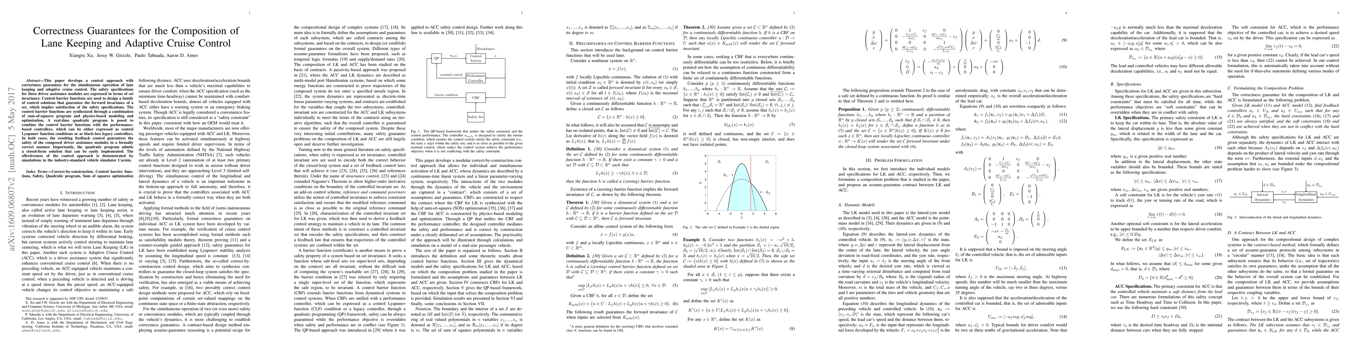 This paper presents a control approach ensuring the safety of combined lane keeping and adaptive cruise control systems through correctness guarantees, utilizing control barrier functions and a real-time quadratic program with a closed-form solution, validated through Carsim simulations.