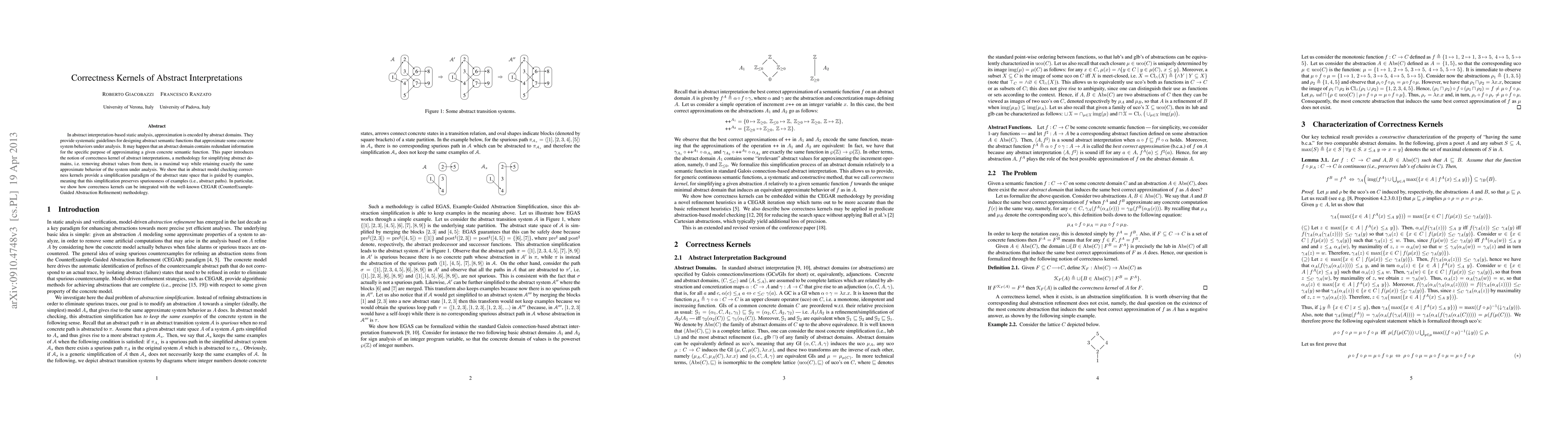 This paper introduces the concept of correctness kernels in abstract interpretation to simplify abstract domains by removing redundant information while preserving the same system behavior approximation. It demonstrates how correctness kernels can enhance CEGAR by simplifying the abstract state space guided by examples, thus preserving spuriousness.