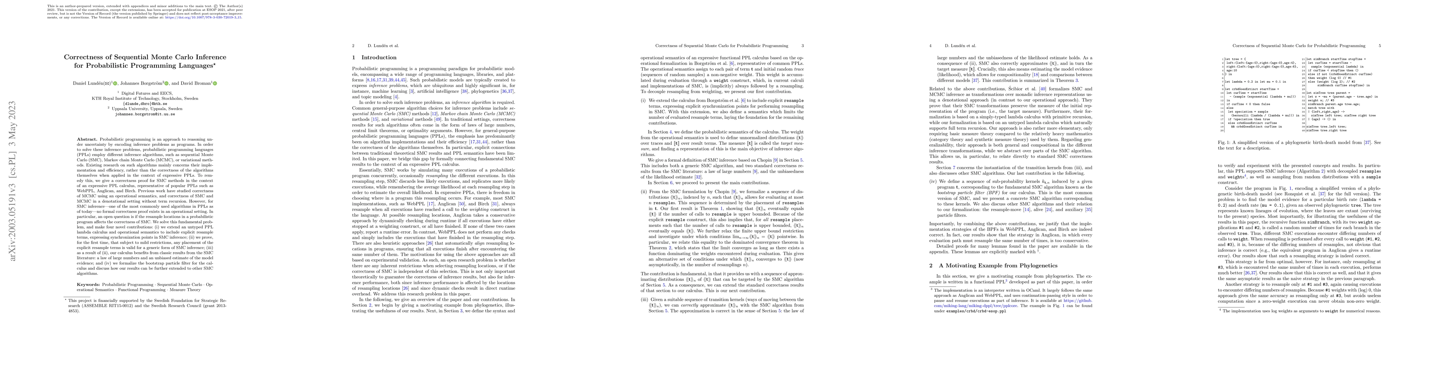 This paper provides a formal correctness proof for sequential Monte Carlo (SMC) inference within an expressive probabilistic programming language (PPL) calculus. It extends the PPL lambda calculus to include explicit resample terms, proving that any placement of these terms is valid under mild restrictions, thereby addressing the open question of resample locations' impact on SMC correctness.