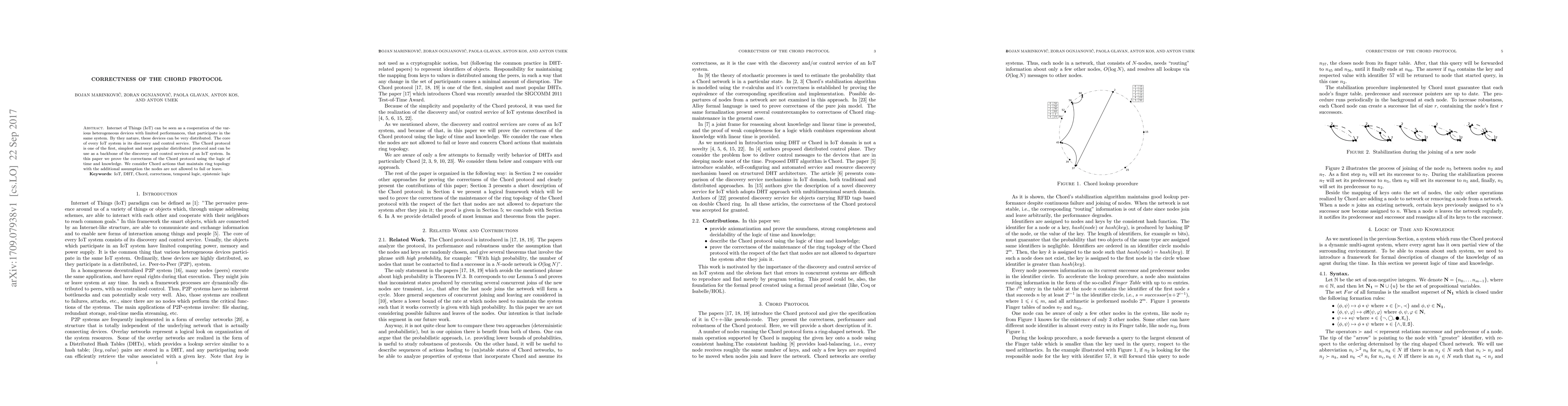 Internet of Things (IoT) can be seen as a cooperation of the various heterogeneous devices with limited performances, that participate in the same system. By they nature, these devices can be very distributed. The core of every IoT system is its discovery and control service. The Chord protocol is one of the first, simplest and most popular distributed protocol and can be use as a backbone of the discovery and control services of an IoT system. In this paper we prove the correctness of the Chord protocol using the logic of time and knowledge. We consider Chord actions that maintain ring topology with the additional assumption the nodes are not allowed to fail or leave.