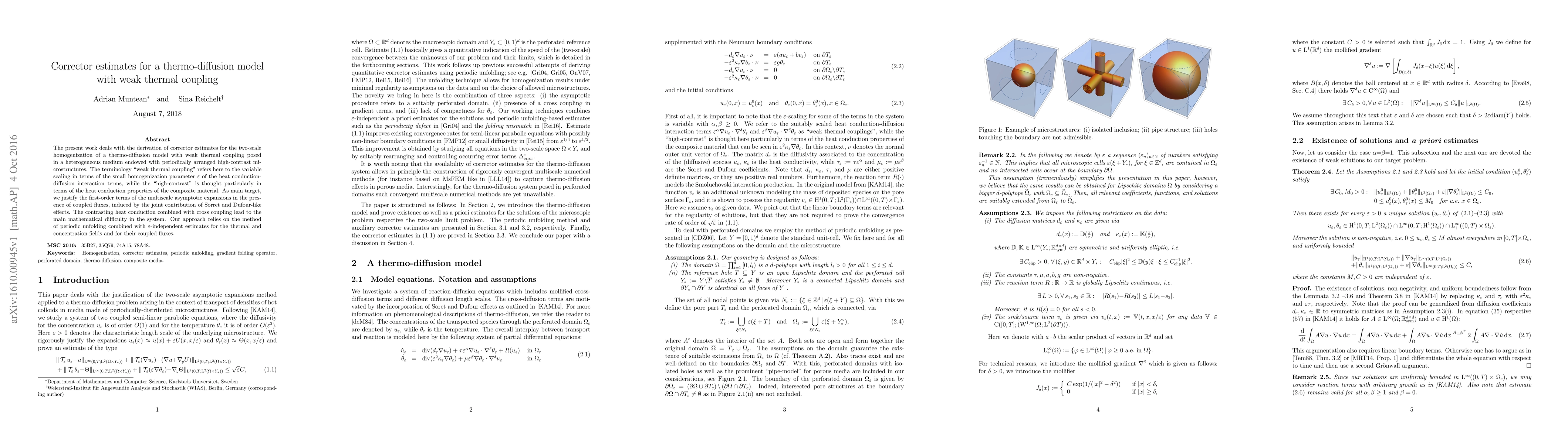This paper derives corrector estimates for the two-scale homogenization of a thermo-diffusion model with weak thermal coupling in a heterogeneous medium with high-contrast microstructures. The study focuses on justifying the first-order terms of the multiscale expansions in the presence of coupled fluxes due to Sorret and Dufour-like effects.