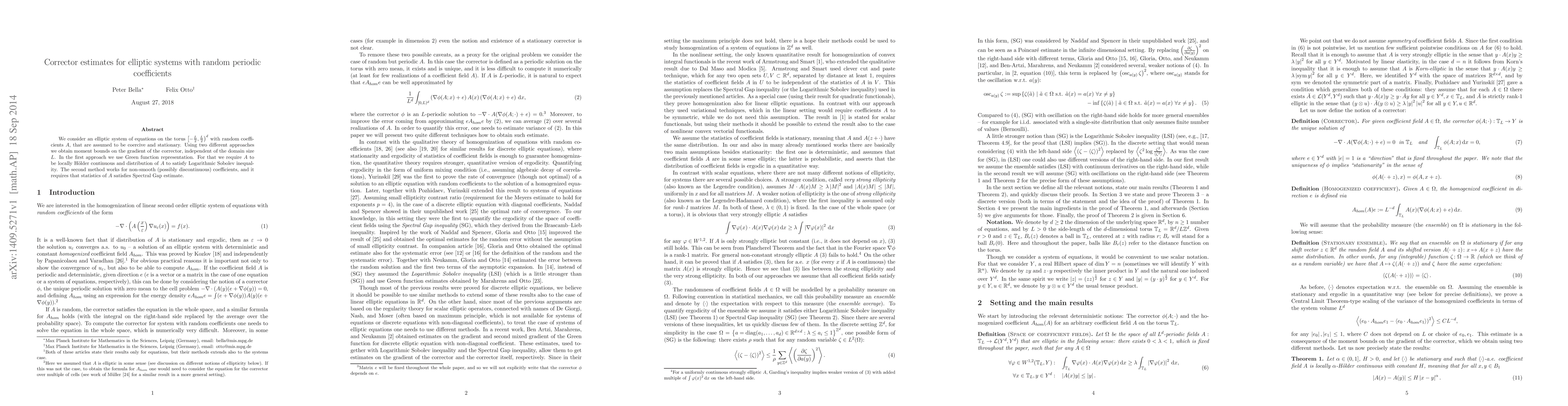 We consider an elliptic system of equations on the torus $\left[ -\frac{L}{2}, \frac{L}{2} \right)^d$ with random coefficients $A$, that are assumed to be coercive and stationary. Using two different approaches we obtain moment bounds on the gradient of the corrector, independent of the domain size $L$. In the first approach we use Green function representation. For that we require $A$ to be locally H\"older continuous and distribution of $A$ to satisfy Logarithmic Sobolev inequality. The second method works for non-smooth (possibly discontinuous) coefficients, and it requires that statistics of $A$ satisfies Spectral Gap estimate.
