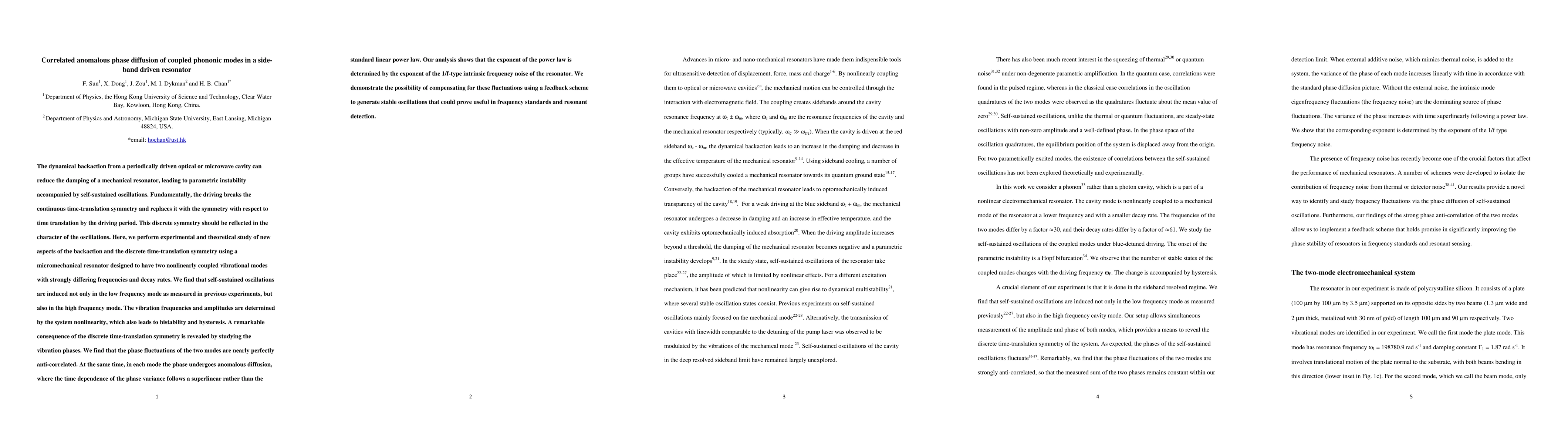 This paper investigates the dynamical backaction and discrete time-translation symmetry in a micromechanical resonator with two coupled phononic modes, revealing self-sustained oscillations in both modes. The study finds nearly perfect anti-correlation in the phase fluctuations of the modes, alongside anomalous phase diffusion, and demonstrates the potential for feedback-based stabilization for applications in frequency standards and resonant detection.