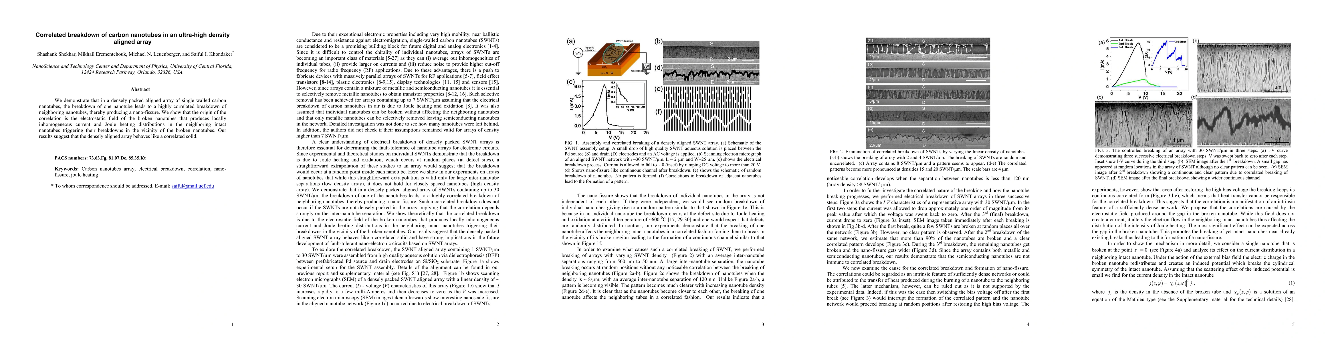 This study reveals that the failure of a single carbon nanotube in a densely packed array leads to a correlated breakdown of adjacent nanotubes due to an electrostatic field from the broken tubes, resulting in nano-fissures and indicating the array functions as a correlated solid.