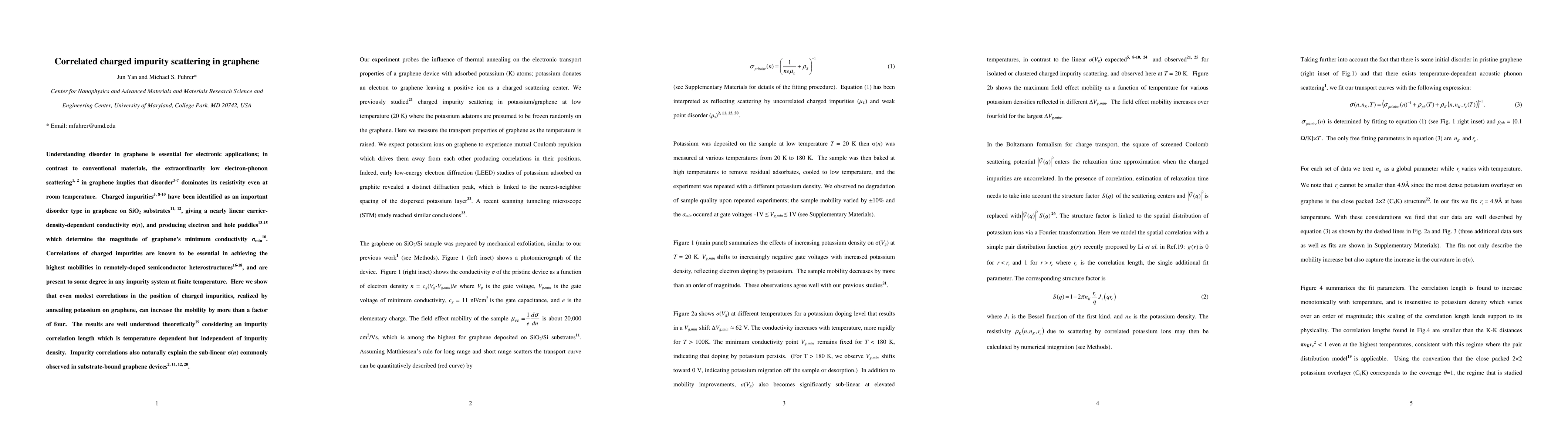 Understanding disorder in graphene is essential for electronic applications; in contrast to conventional materials, the extraordinarily low electron-phonon scattering1, 2 in graphene implies that disorder3-7 dominates its resistivity even at room temperature. Charged impurities5, 8-10 have been identified as an important disorder type in graphene on SiO2 substrates11, 12, giving a nearly linear carrier-density-dependent conductivity {\sigma}(n), and producing electron and hole puddles13-15 which determine the magnitude of graphene's minimum conductivity {\sigma}min10. Correlations of charged impurities are known to be essential in achieving the highest mobilities in remotely-doped semiconductor heterostructures16-18, and are present to some degree in any impurity system at finite temperature. Here we show that even modest correlations in the position of charged impurities, realized by annealing potassium on graphene, can increase the mobility by more than a factor of four. The results are well understood theoretically19 considering an impurity correlation length which is temperature dependent but independent of impurity density. Impurity correlations also naturally explain the sub-linear {\sigma}(n) commonly observed in substrate-bound graphene devices2, 11, 12, 20.