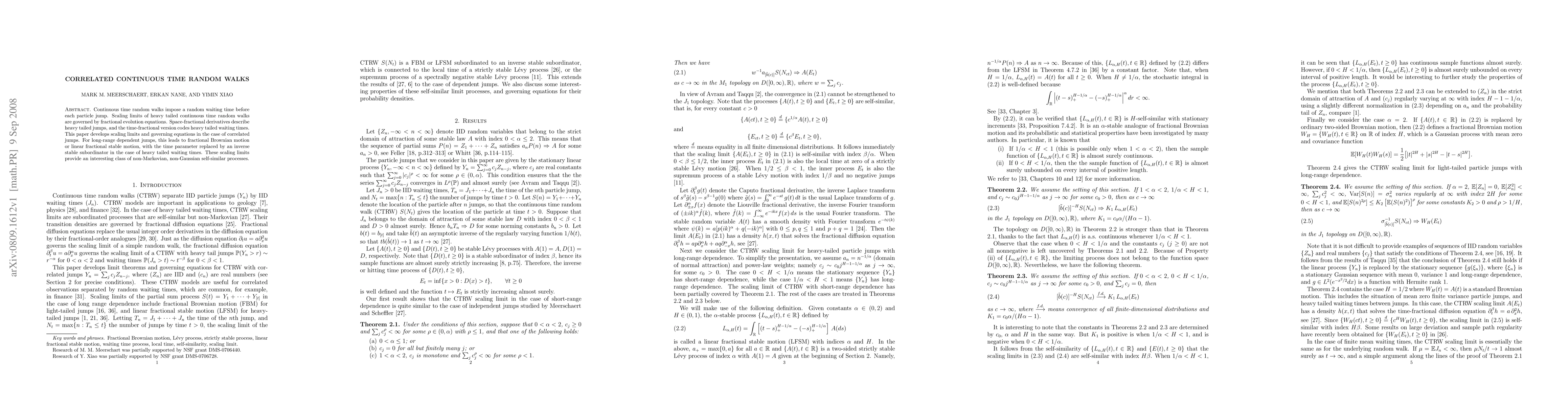 Continuous time random walks impose a random waiting time before each particle jump. Scaling limits of heavy tailed continuous time random walks are governed by fractional evolution equations. Space-fractional derivatives describe heavy tailed jumps, and the time-fractional version codes heavy tailed waiting times. This paper develops scaling limits and governing equations in the case of correlated jumps. For long-range dependent jumps, this leads to fractional Brownian motion or linear fractional stable motion, with the time parameter replaced by an inverse stable subordinator in the case of heavy tailed waiting times. These scaling limits provide an interesting class of non-Markovian, non-Gaussian self-similar processes.