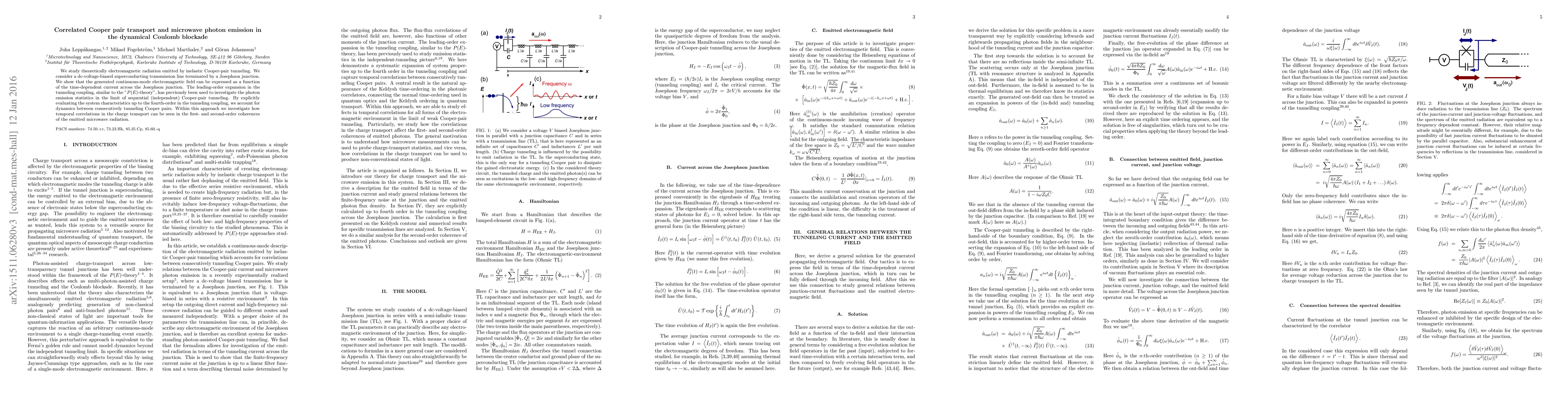 This paper theoretically investigates electromagnetic radiation from inelastic Cooper-pair tunneling in a dc-voltage-biased superconducting transmission line with a Josephson junction, showing how the emitted microwave photons correlate with the time-dependent current. The study extends previous "$P(E)$-theory" by considering dynamics between tunneling pairs up to fourth-order, revealing temporal correlations in charge transport through the coherences of emitted radiation.