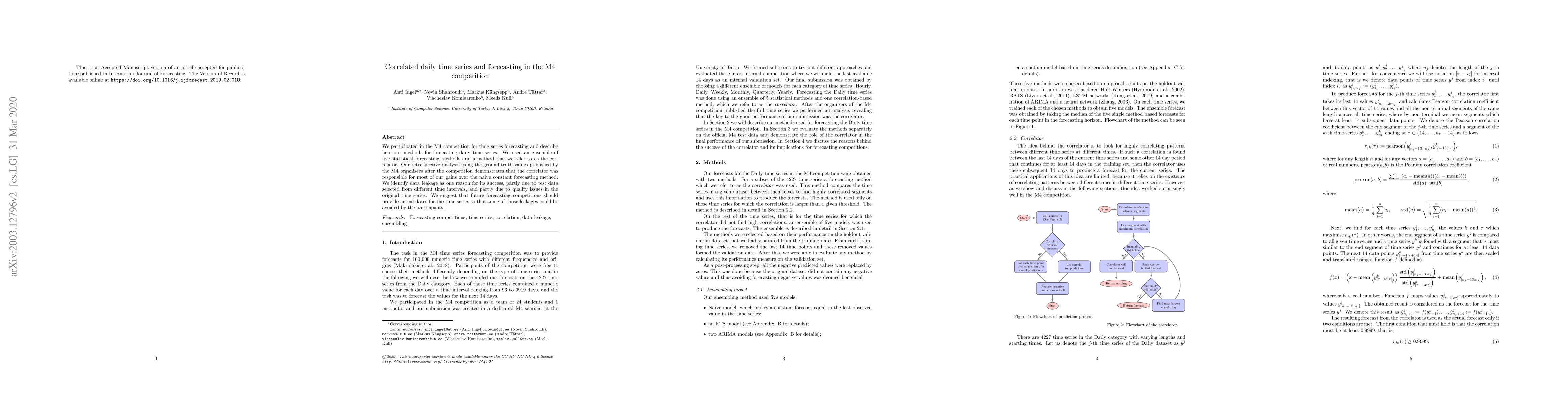 We participated in the M4 competition for time series forecasting and describe here our methods for forecasting daily time series. We used an ensemble of five statistical forecasting methods and a method that we refer to as the correlator. Our retrospective analysis using the ground truth values published by the M4 organisers after the competition demonstrates that the correlator was responsible for most of our gains over the naive constant forecasting method. We identify data leakage as one reason for its success, partly due to test data selected from different time intervals, and partly due to quality issues in the original time series. We suggest that future forecasting competitions should provide actual dates for the time series so that some of those leakages could be avoided by the participants.