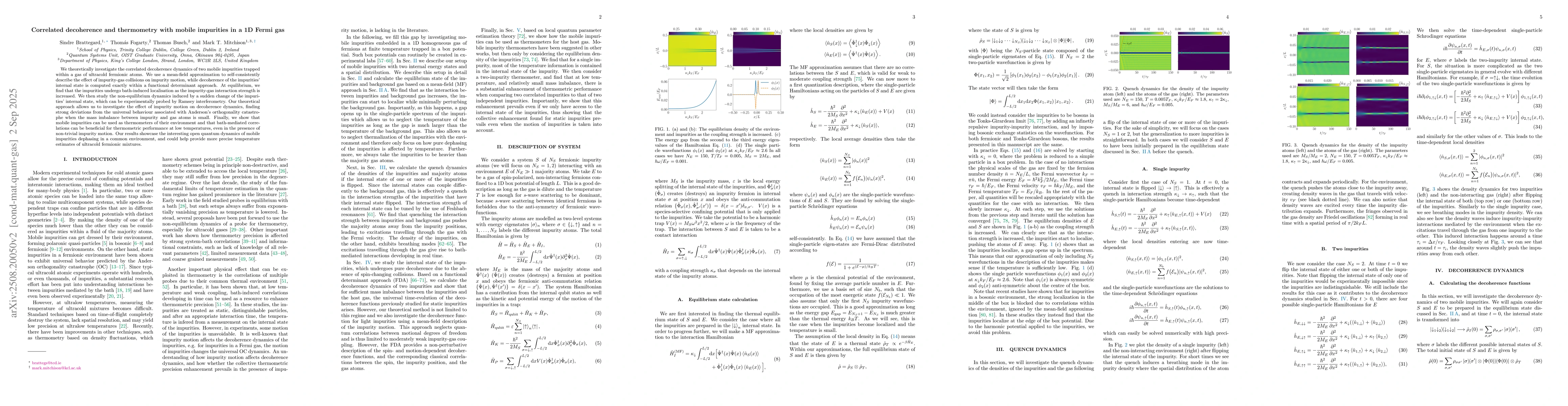 We theoretically investigate the correlated decoherence dynamics of two mobile impurities trapped within a gas of ultracold fermionic atoms. We use a mean-field approximation to self-consistently describe the effect of impurity-gas collisions on impurity motion, while decoherence of the impurities' internal state is computed exactly within a functional determinant approach. At equilibrium, we find that the impurities undergo bath-induced localisation as the impurity-gas interaction strength is increased. We then study the non-equilibrium dynamics induced by a sudden change of the impurities' internal state, which can be experimentally probed by Ramsey interferometry. Our theoretical approach allows us to investigate the effect of impurity motion on decoherence dynamics, finding strong deviations from the universal behaviour associated with Anderson's orthogonality catastrophe when the mass imbalance between impurity and gas atoms is small. Finally, we show that mobile impurities can be used as thermometers of their environment and that bath-mediated correlations can be beneficial for thermometric performance at low temperatures, even in the presence of non-trivial impurity motion. Our results showcase the interesting open quantum dynamics of mobile impurities dephasing in a common environment, and could help provide more precise temperature estimates of ultracold fermionic mixtures.