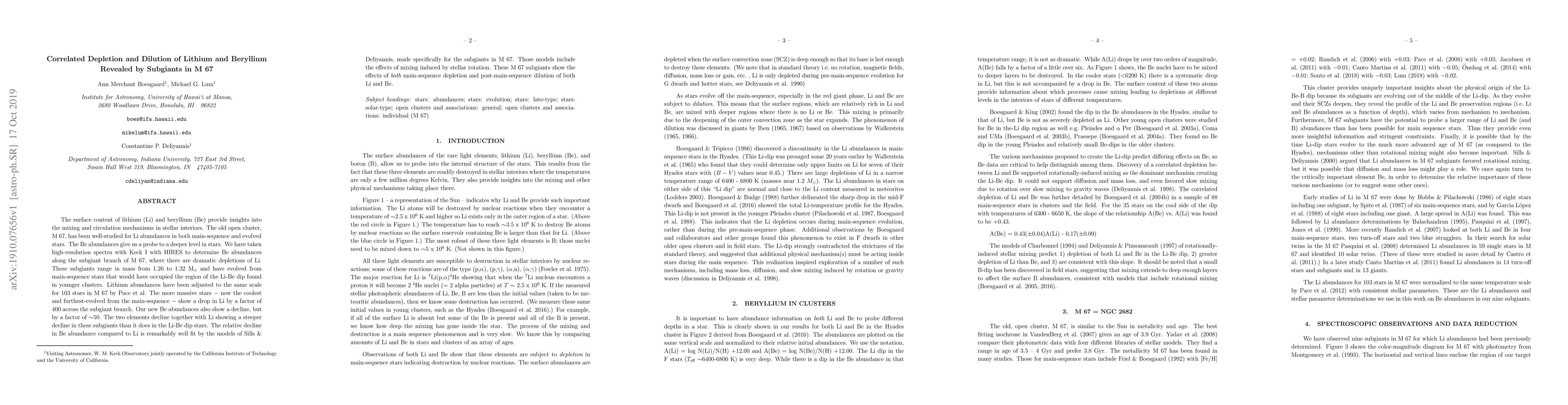The surface content of lithium (Li) and beryllium (Be) provide insights into the mixing and circulation mechanisms in stellar interiors. The old open cluster, M 67, has been well-studied for Li abundances in both main-sequence and evolved stars. The Be abundances give us a probe to a deeper level in stars. We have taken high-resolution spectra with Keck I with HIRES to determine Be abundances along the subgiant branch of M 67, where there are dramatic depletions of Li. These subgiants range in mass from 1.26 to 1.32 M$_{\odot}$ and have evolved from main-sequence stars that would have occupied the region of the Li-Be dip found in younger clusters. Lithium abundances have been adjusted to the same scale for 103 stars in M 67 by Pace et al. The more massive stars $-$ now the coolest and furthest-evolved from the main-sequence $-$ show a drop in Li by a factor of 400 across the subgiant branch. Our new Be abundances also show a decline, but by a factor of $\sim$50. The two elements decline together with Li showing a steeper decline in these subgiants than it does in the Li-Be dip stars. The relative decline in Be abundance compared to Li is remarkably well fit by the models of Sills & Deliyannis, made specifically for the subgiants in M 67. Those models include the effects of mixing induced by stellar rotation. These M 67 subgiants show the effects of both main-sequence depletion and post-main-sequence dilution of both Li and Be.