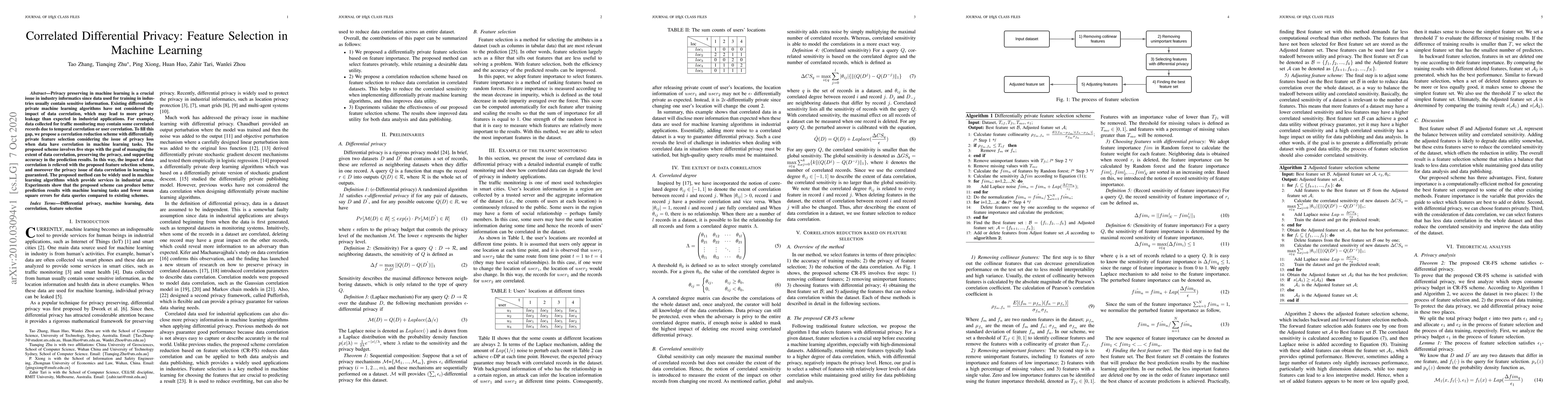 Privacy preserving in machine learning is a crucial issue in industry informatics since data used for training in industries usually contain sensitive information. Existing differentially private machine learning algorithms have not considered the impact of data correlation, which may lead to more privacy leakage than expected in industrial applications. For example, data collected for traffic monitoring may contain some correlated records due to temporal correlation or user correlation. To fill this gap, we propose a correlation reduction scheme with differentially private feature selection considering the issue of privacy loss when data have correlation in machine learning tasks. %The key to the proposed scheme is to describe the data correlation and select features which leads to less data correlation across the whole dataset. The proposed scheme involves five steps with the goal of managing the extent of data correlation, preserving the privacy, and supporting accuracy in the prediction results. In this way, the impact of data correlation is relieved with the proposed feature selection scheme, and moreover, the privacy issue of data correlation in learning is guaranteed. The proposed method can be widely used in machine learning algorithms which provide services in industrial areas. Experiments show that the proposed scheme can produce better prediction results with machine learning tasks and fewer mean square errors for data queries compared to existing schemes.