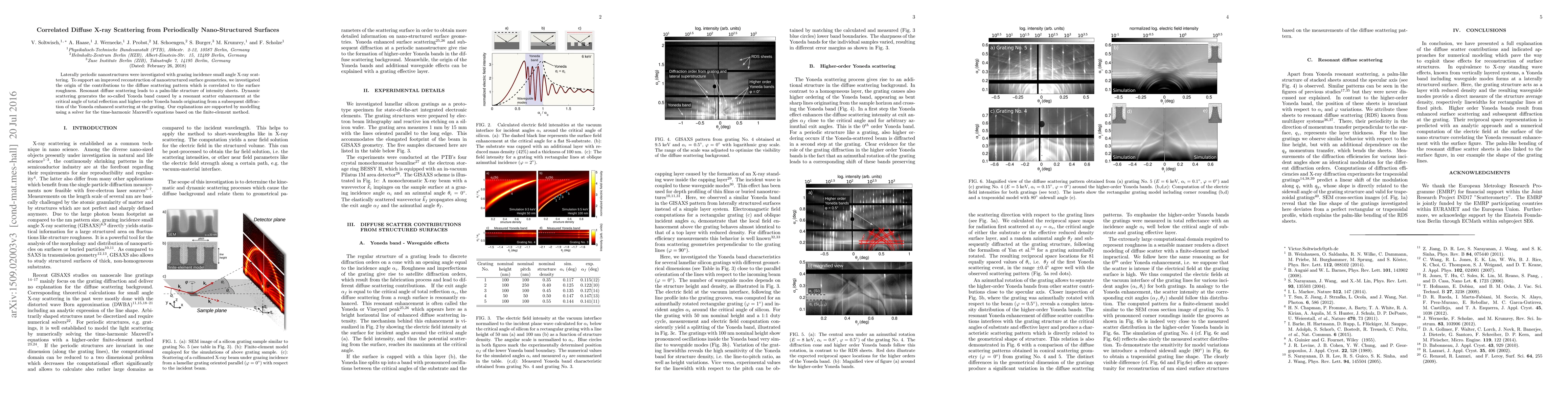 This research investigates the scattering patterns from laterally periodic nanostructures using grazing incidence small angle X-ray scattering, focusing on the contributions to diffuse scattering linked to surface roughness. The study identifies resonant and dynamic scattering mechanisms, including the formation of intensity sheets and Yoneda bands, supported by modeling based on the finite-element method.