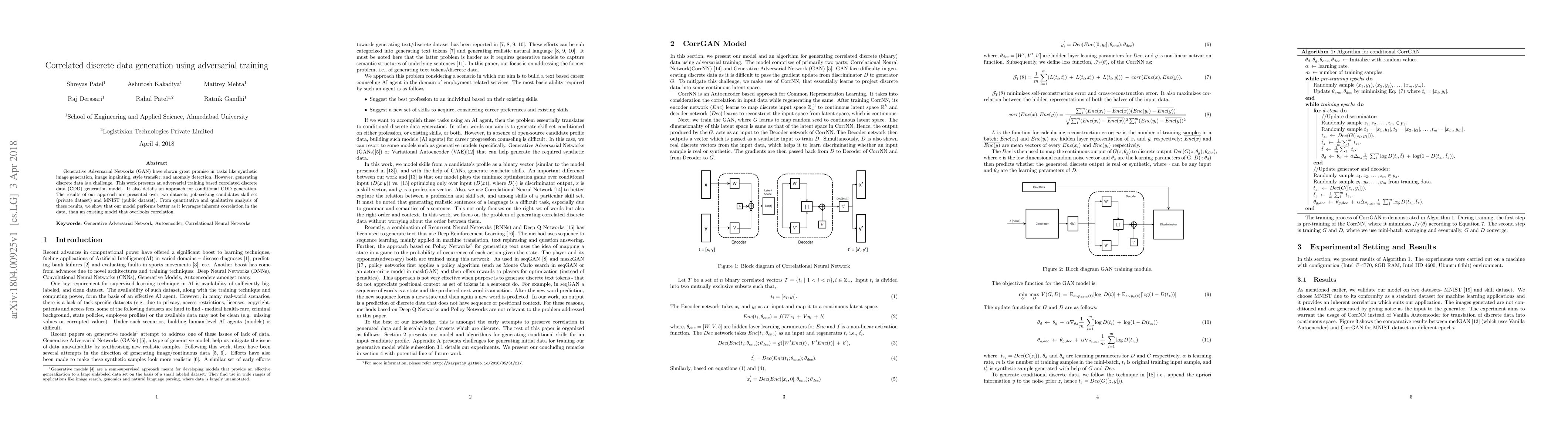 A new method for generating correlated discrete data using adversarial training outperforms existing models on two datasets, including a private job-seeking candidates dataset and the public MNIST dataset.