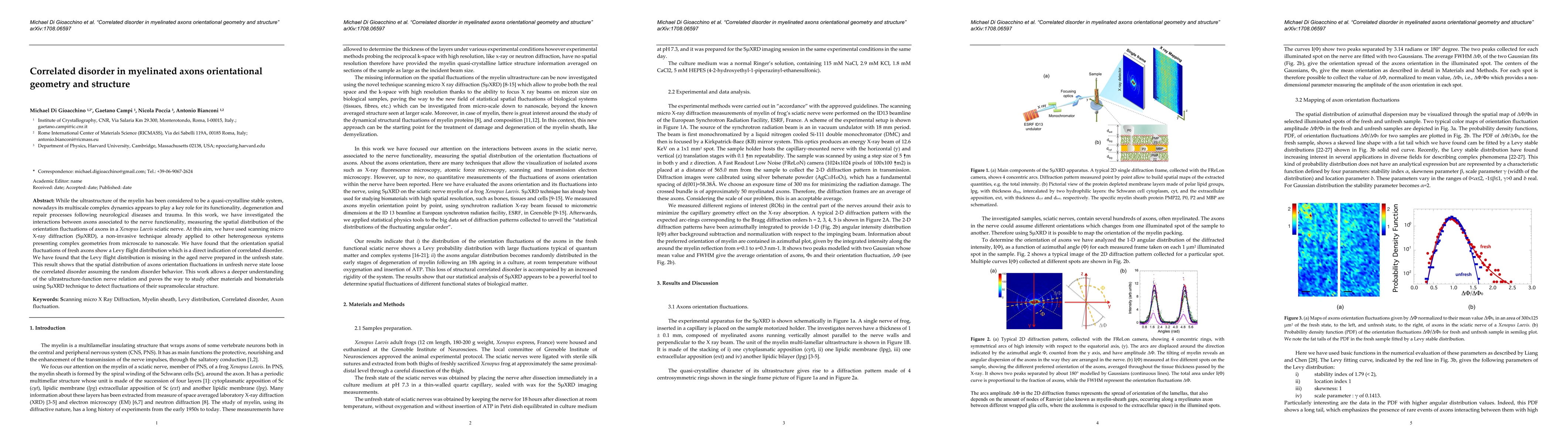 This paper investigates the spatial distribution of axon orientational fluctuations in a Xenopus Laevis sciatic nerve using Scanning micro X-ray Diffraction, revealing a correlated disorder in fresh axons described by Levy flight distribution. The study finds that this correlated disorder diminishes in aged nerves, transitioning to random disorder, providing insights into nerve degeneration and potential applications for biomaterials analysis.