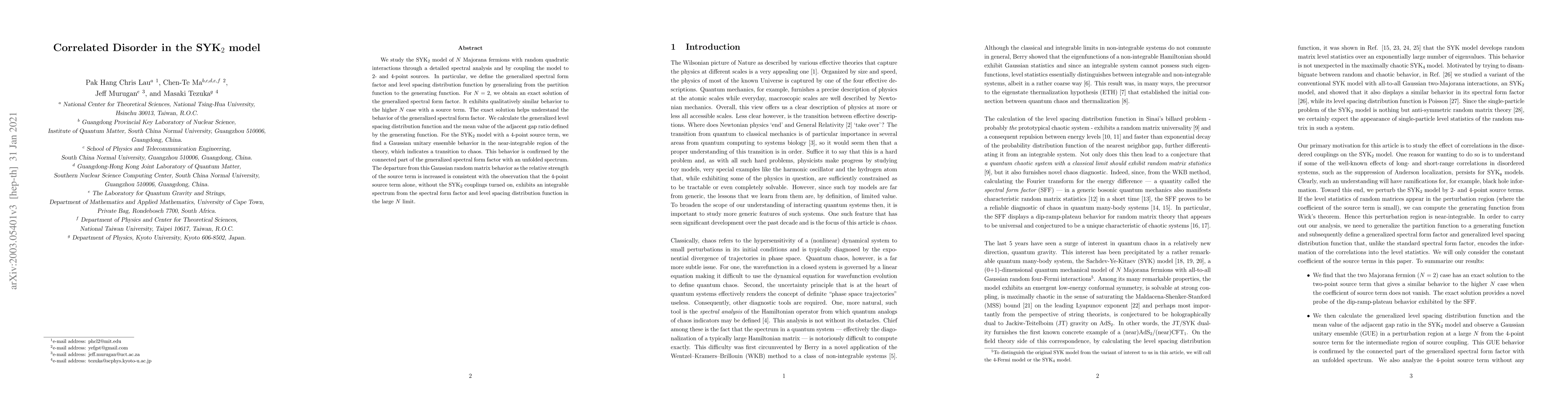 This paper investigates the SYK$_{2}$ model with $N=2$ Majorana fermions using spectral analysis and coupling to sources. It finds an exact solution for the generalized spectral form factor, revealing chaotic behavior in the presence of a 4-point source term, indicating a transition to chaos in the near-integrable region.