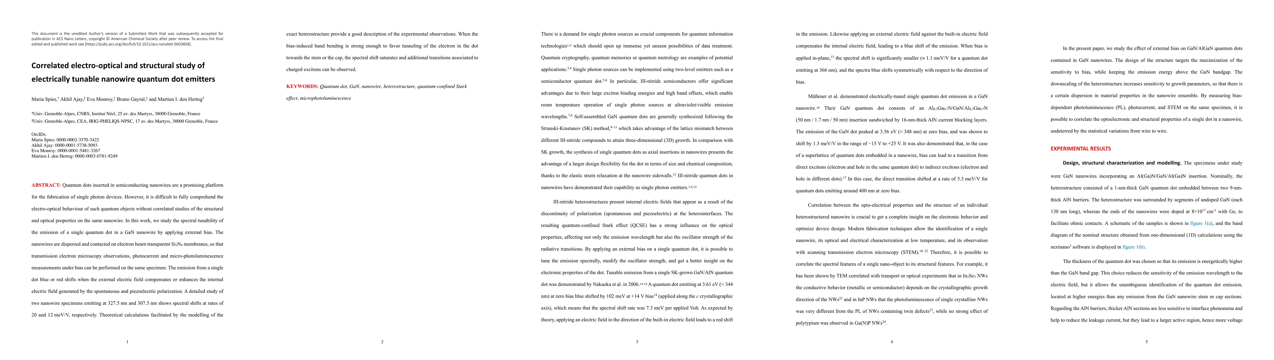 This research investigates the spectral tunability of a single quantum dot in a GaN nanowire's emission under external electrical bias, utilizing transmission electron microscopy, photocurrent, and micro-photoluminescence measurements. Results show blue or red shifts in emission depending on the bias, with shifts of 20 meV/V and 12 meV/V for two specimens emitting at 327.5 nm and 307.5 nm, respectively. These findings contribute to understanding and controlling quantum dot emitters in nanowires for single-photon devices.