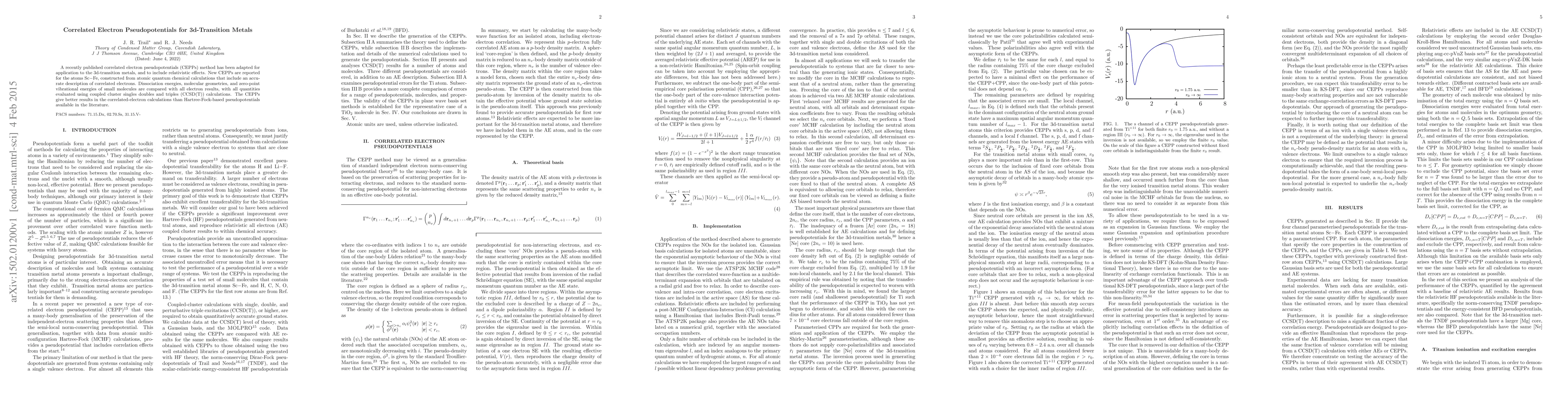 A recently published correlated electron pseudopotentials (CEPPs) method has been adapted for application to the 3d-transition metals, and to include relativistic effects. New CEPPs are reported for the atoms Sc$-$Fe, constructed from atomic quantum chemical calculations that include an accurate description of correlated electrons. Dissociation energies, molecular geometries, and zero-point vibrational energies of small molecules are compared with all electron results, with all quantities evaluated using coupled cluster singles doubles and triples (CCSD(T)) calculations. The CEPPs give better results in the correlated-electron calculations than Hartree-Fock-based pseudopotentials available in the literature.