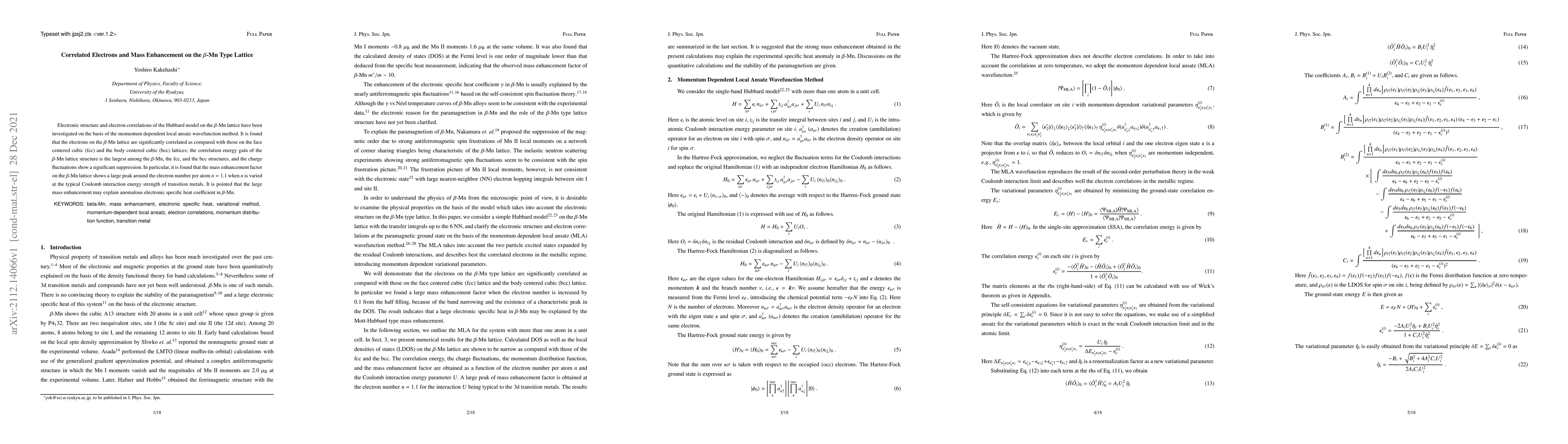 Electronic structure and electron correlations of the Hubbard model on the Beta-Mn lattice have been investigated on the basis of the momentum dependent local ansatz wavefunction method. It is found that the electrons on the Beta-Mn lattice are significantly correlated as compared with those on the face centered cubic (fcc) and the body centered cubic (bcc) lattices; the correlation energy gain of the Beta-Mn lattice structure is the largest among the Beta-Mn, the fcc, and the bcc structures, and the charge fluctuations show a significant suppression. In particular, it is found that the mass enhancement factor on the Beta-Mn lattice shows a large peak around the electron number per atom n=1.1 when n is varied at the typical Coulomb interaction energy strength of transition metals. It is pointed that the large mass enhancement may explain anomalous electronic specific heat coefficient in Beta-Mn.