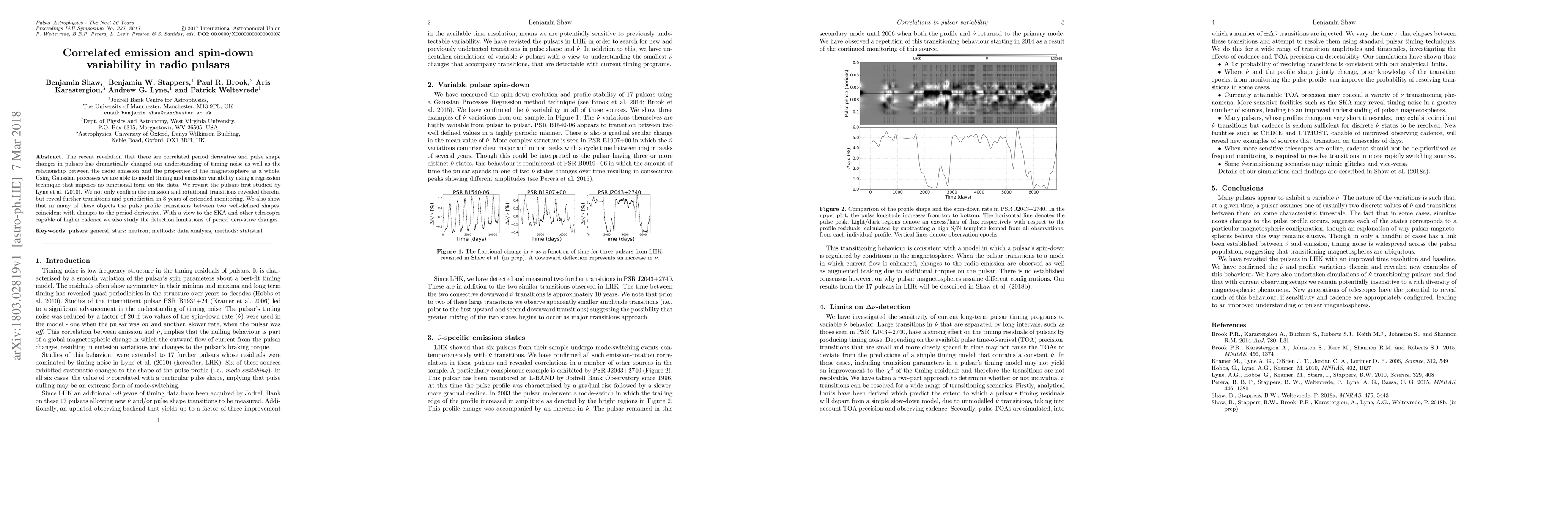 The recent revelation that there are correlated period derivative and pulse shape changes in pulsars has dramatically changed our understanding of timing noise as well as the relationship between the radio emission and the properties of the magnetosphere as a whole. Using Gaussian processes we are able to model timing and emission variability using a regression technique that imposes no functional form on the data. We revisit the pulsars first studied by Lyne et al. (2010). We not only confirm the emission and rotational transitions revealed therein, but reveal further transitions and periodicities in 8 years of extended monitoring. We also show that in many of these objects the pulse profile transitions between two well-defined shapes, coincident with changes to the period derivative. With a view to the SKA and other telescopes capable of higher cadence we also study the detection limitations of period derivative changes.