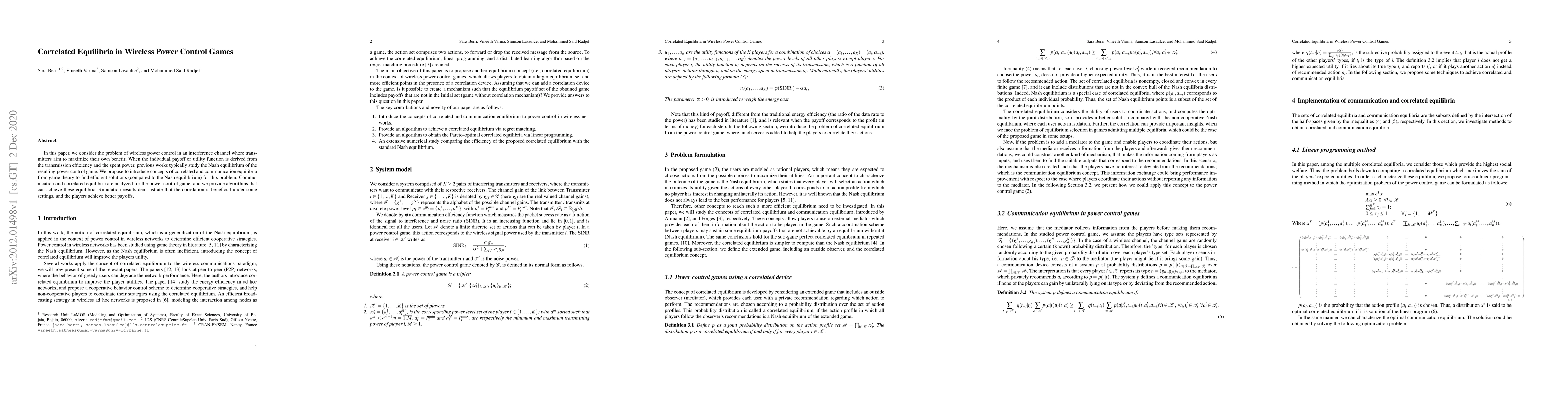 This paper explores wireless power control in interference channels using correlated and communication equilibria from game theory, proposing algorithms to achieve these equilibria for improved efficiency over Nash equilibrium. Simulation results show that correlated strategies can lead to better payoffs for transmitters under certain conditions.