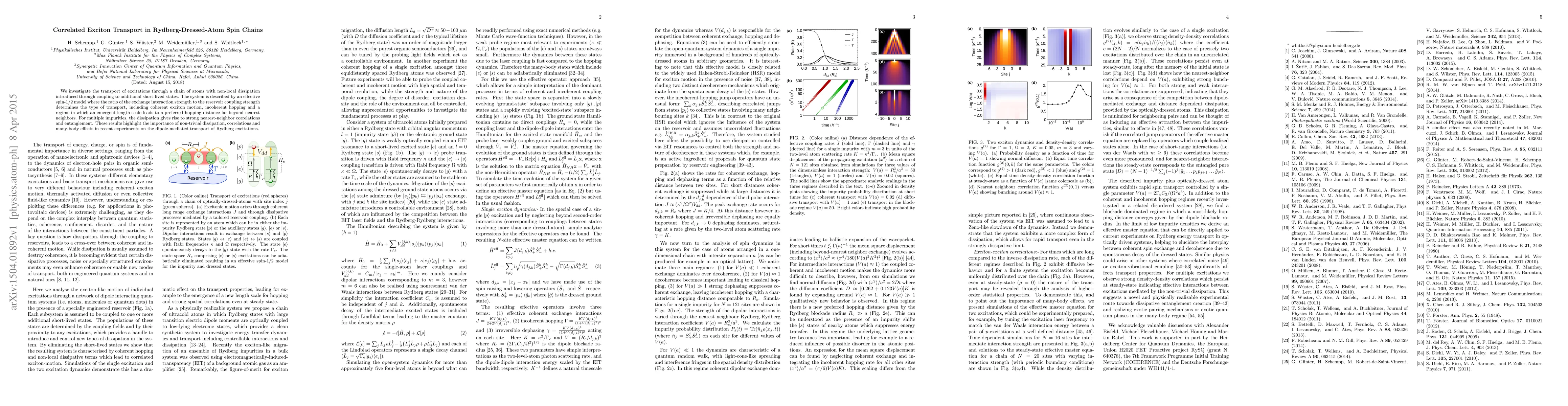 We investigate the transport of excitations through a chain of atoms with non-local dissipation introduced through coupling to additional short-lived states. The system is described by an effective spin-1/2 model where the ratio of the exchange interaction strength to the reservoir coupling strength determines the type of transport, including coherent exciton motion, incoherent hopping and a regime in which an emergent length scale leads to a preferred hopping distance far beyond nearest neighbors. For multiple impurities, the dissipation gives rise to strong nearest-neighbor correlations and entanglement. These results highlight the importance of non-trivial dissipation, correlations and many-body effects in recent experiments on the dipole-mediated transport of Rydberg excitations.